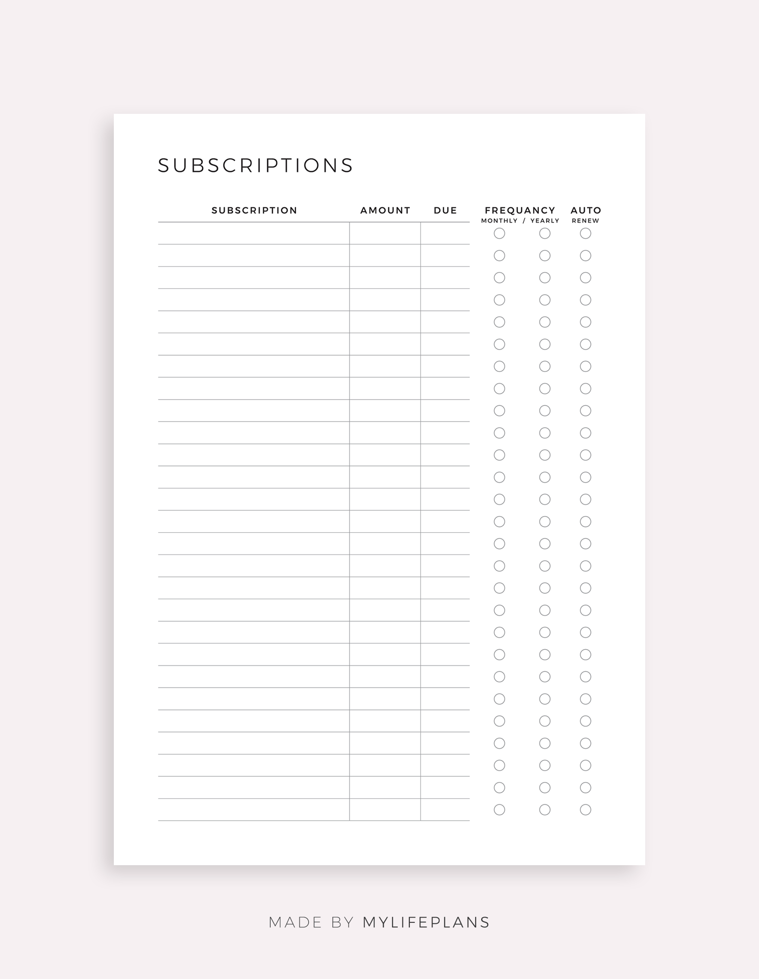 This is a printable subscription tracker — just download, print, and start using it right away.