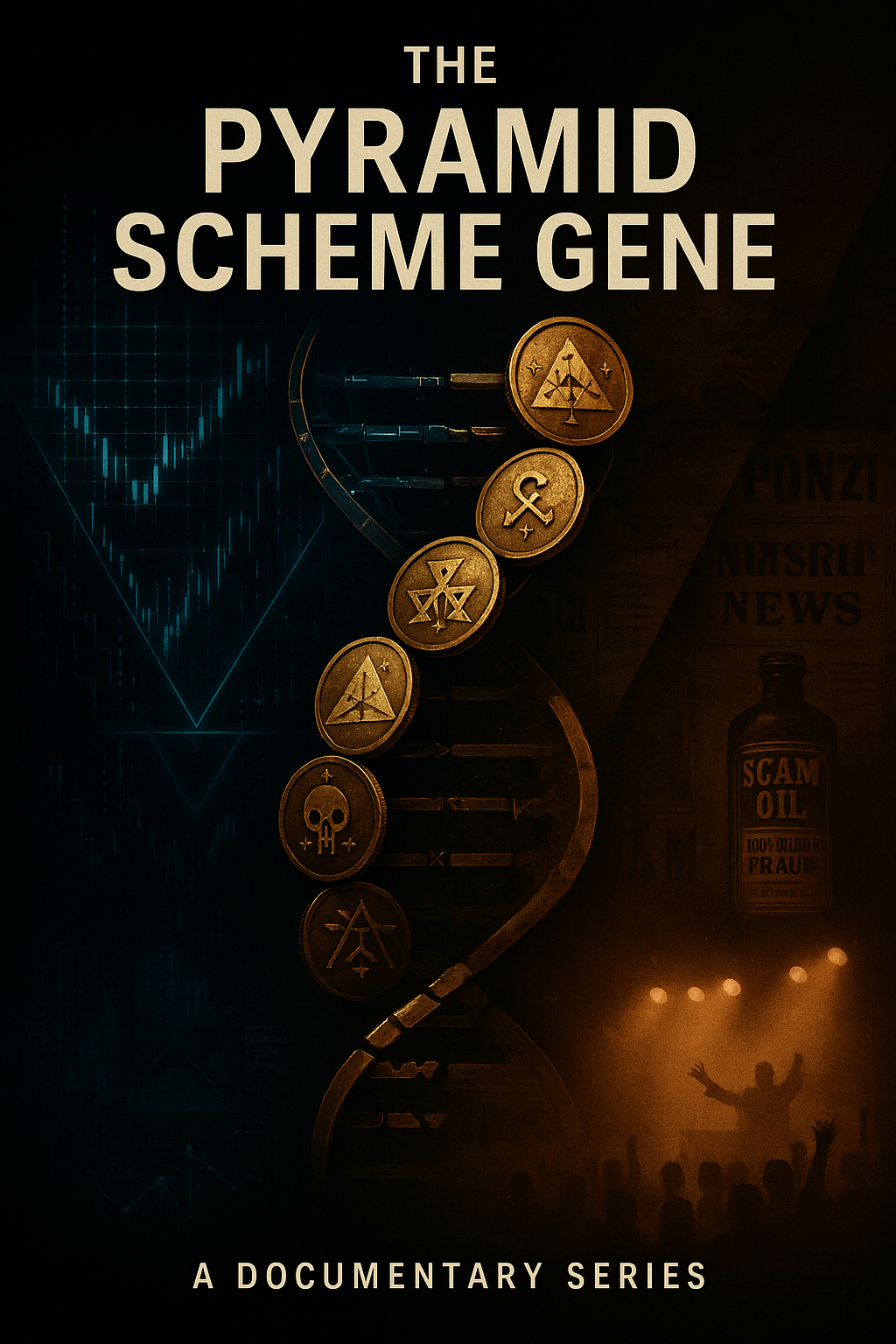 Every bubble is a biography of belief, and this one finally admits the con in the code. A limited nonfiction series that reframes crypto as the latest expression of the Pyramid Scheme Gene—mapping blockchains onto snake oil, Ponzi scaffolds, televangelist theatrics, and MLM psychology to give viewers a permanent scam-detection system.