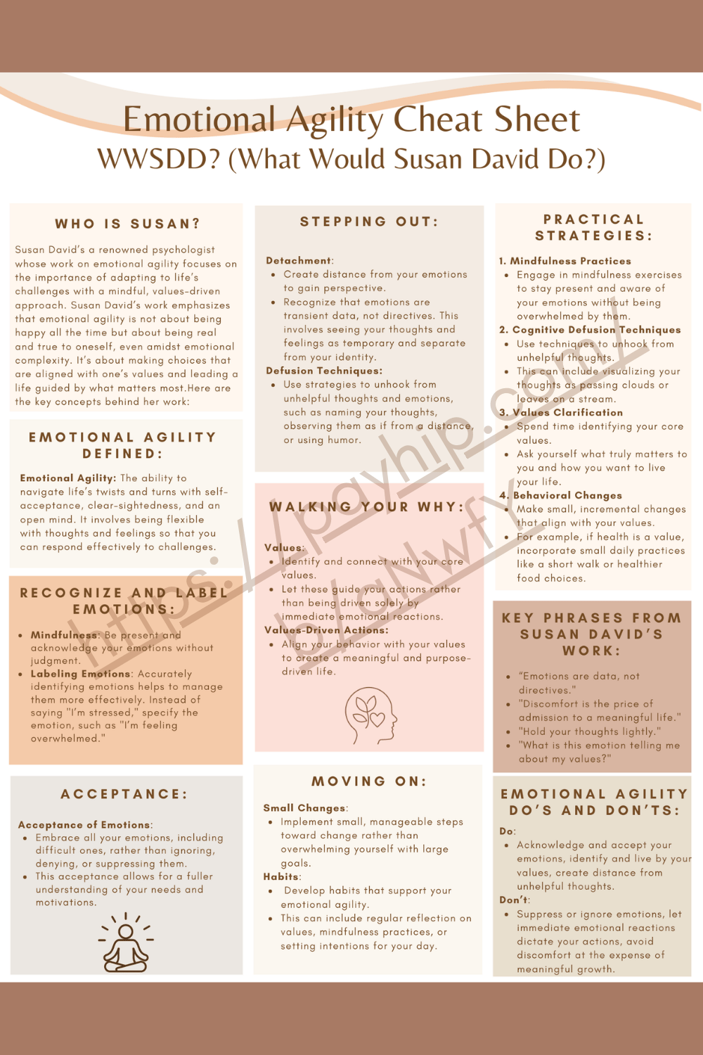 Emotional Agility Cheat Sheet: Susan David's Key Concepts (Therapy Resource)
