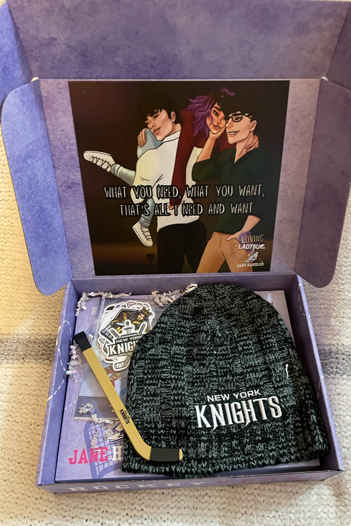 EARLY BLACK FRIDAY SALE! Ladybug book box! Signed paperbacks of both parts one and parts two, New York Knights beanie, hockey stick pen, art prints, stickers, and a bookmark. Shipping included. Only ships to US, so sorry. STICKERS AND ART PRINTS MAY VARY.