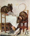 The Tale of Two Bad Mice is a children's book written and illustrated by Beatrix Potter, and published by Frederick Warne & Co. in September 1904. The tale is about two mice who vandalize a dollhouse. After finding the food on the dining room table made of plaster, they smash the dishes, throw the doll clothing out the window, tear the bolster, and carry off a number of articles to their mouse-hole. When the little girl who owns the dollhouse discovers the destruction, she positions a policeman doll outside the front door to ward off any future depredation. The two mice atone for their crime spree by putting a crooked sixpence in the doll's stocking on Christmas Eve and sweeping the house every morning with a dust-pan and broom.