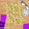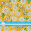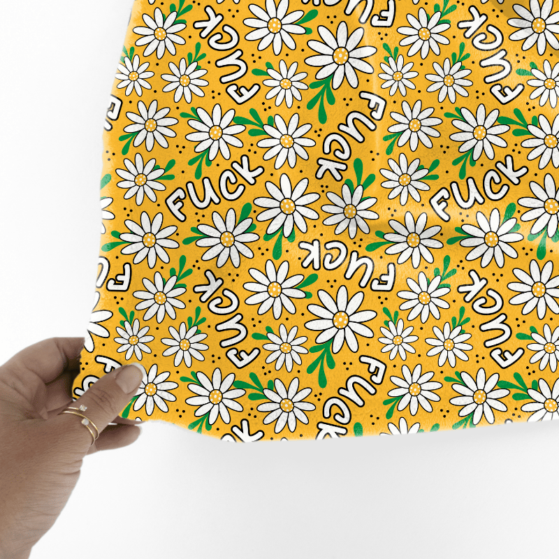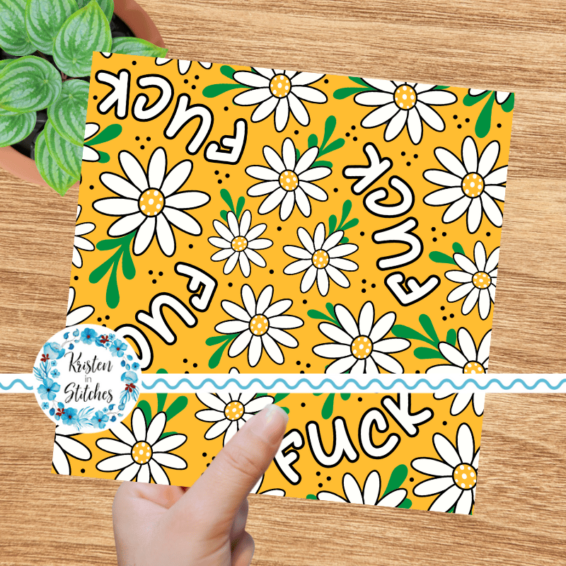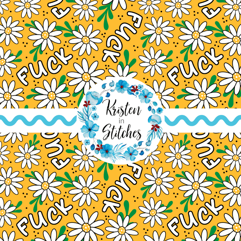 Pretty profanities- the f-word with white daisy flowers on yellow.