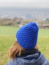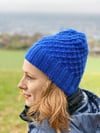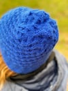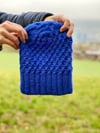 Käferberg is knitted in rounds from the bottom up. The textured pattern is knitted with slipped stitches and cables. The knitting pattern gives different lengths so you can knit the hat to your liking.