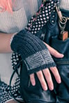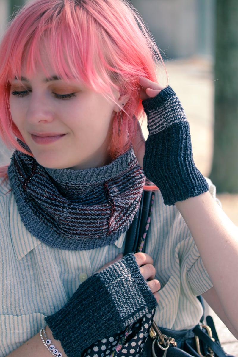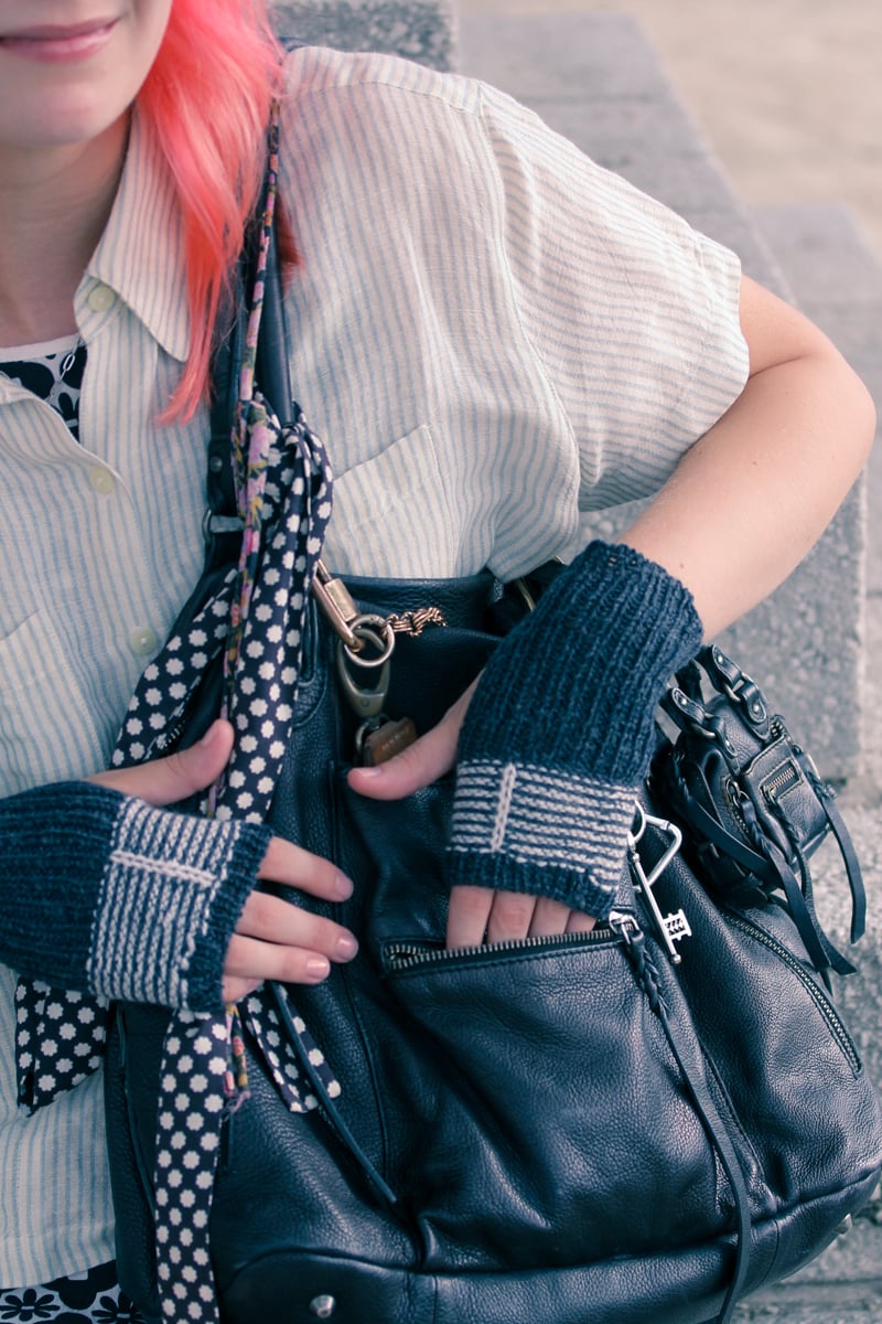 Worked in the round from cuff to fingertips, Ink Mitts use the helix knitting technique to create easy jogless one-row stripes on fingerless mitts offered in two versions – thumbless or with an ergonomic gusseted thumb. Completely reversible thanks to invisible color changes, one side displays stockinette and the other reverse stockinette, each with a slipped stitch decorative linear detail. Pair two contrasting colors, and revel in using up leftovers for the stripes; your versatile fingering weight yarn makes chic lightweight mitts.