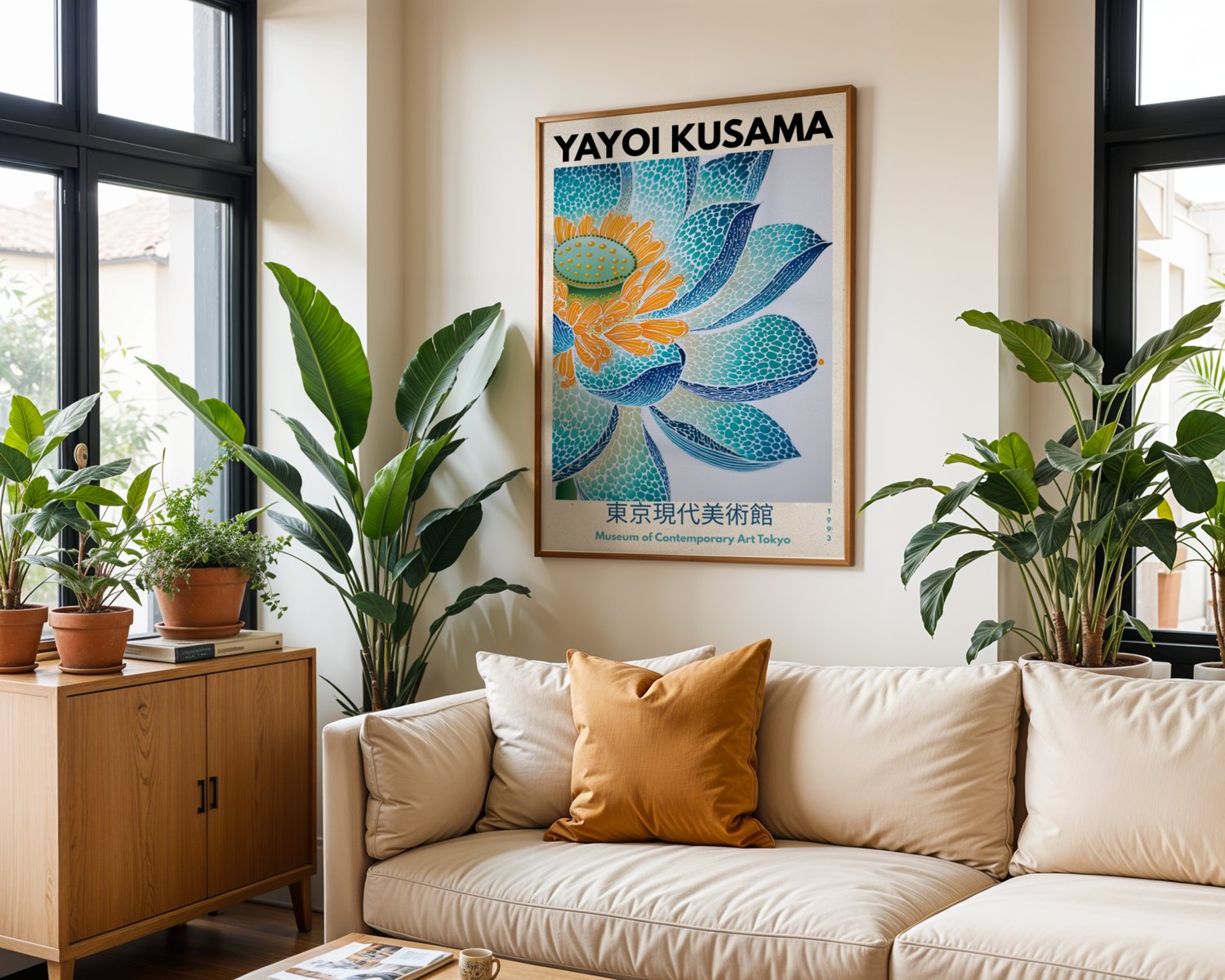 Bring bold colour, texture, and contemporary gallery energy into your home with this Yayoi Kusama inspired floral poster. Designed with layered botanical forms and signature dotted textures, this statement artwork captures the spirit of modern Japanese design while creating a calm yet expressive focal point in your space.