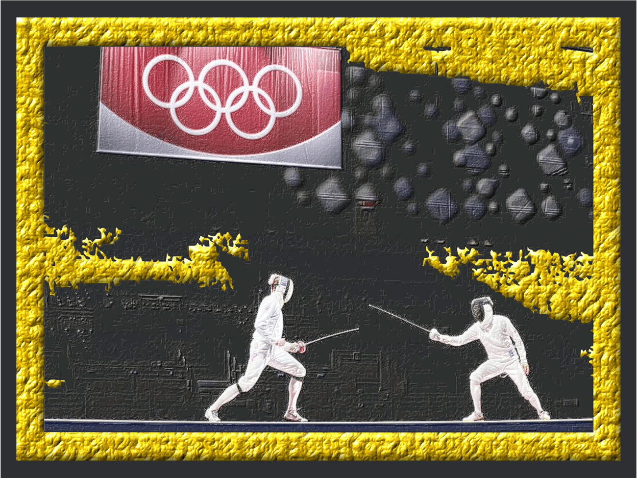 - Depicts fencers in competitive action at the Olympics