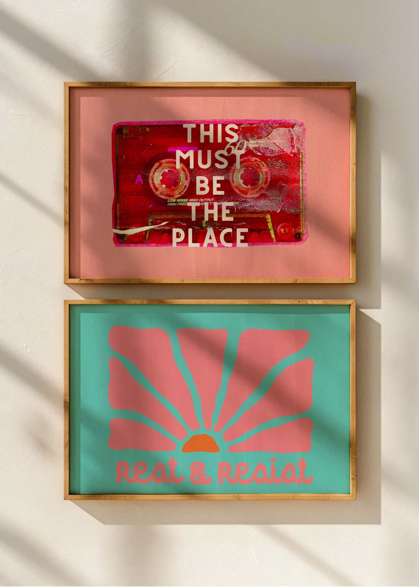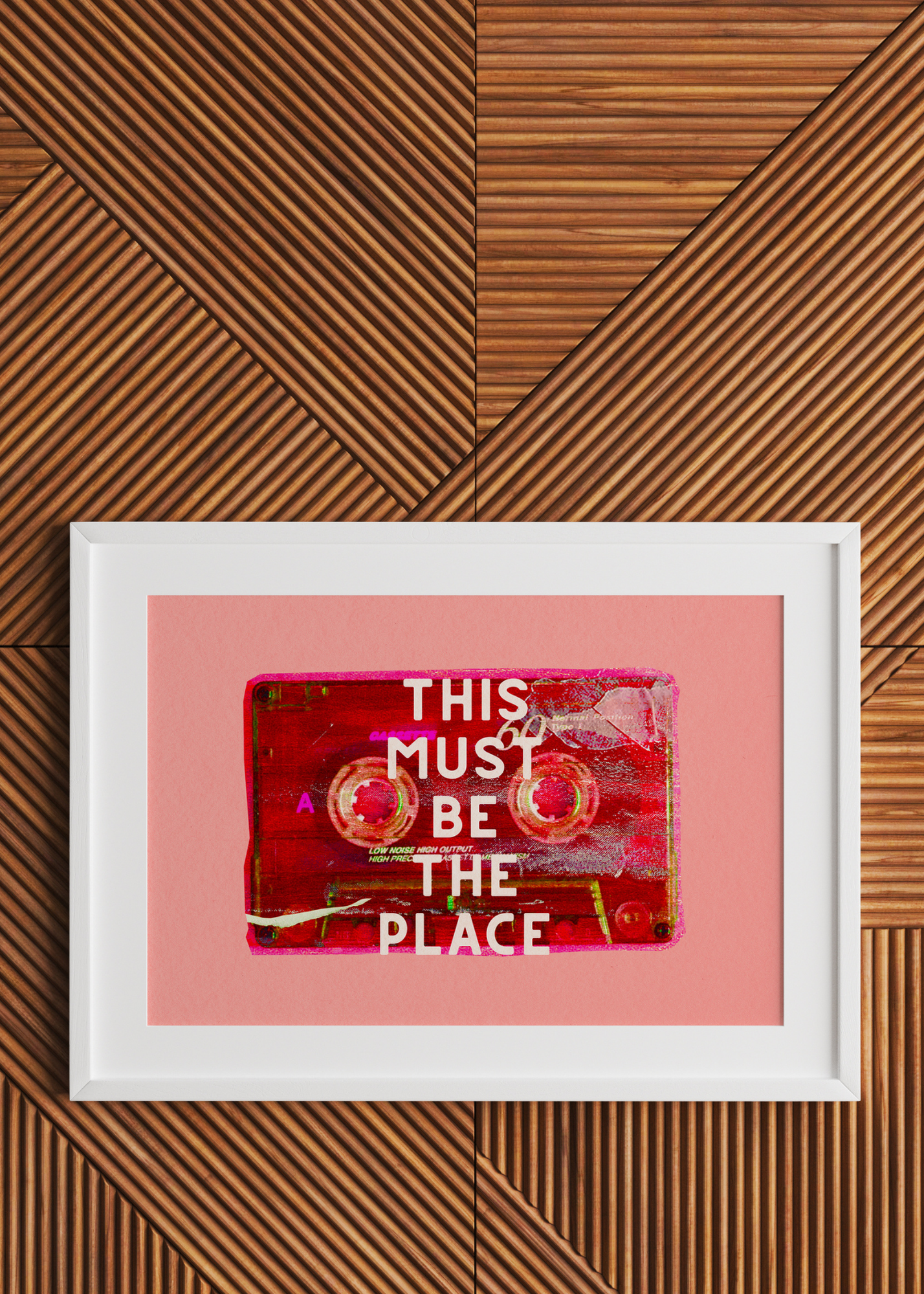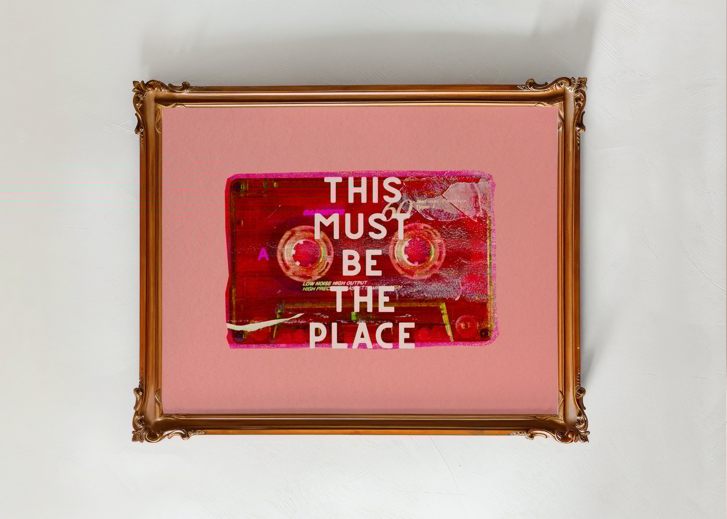 This Must Be the Place— Retro meets heart in this nostalgic cassette piece. This print features a light pink background with a bold pink and deep red cassette. Written across it in a bold white font: "This must be the place." A tribute to good vibes and the songs that make a place feel like home.