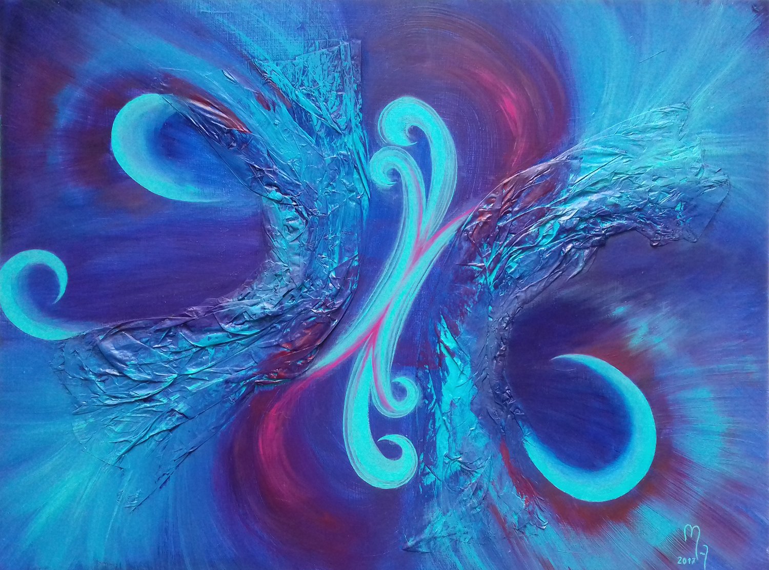 The Power of Water is a mixed media piece that explores the dynamic force and fluid grace of water through layered shades of blue, flowing turquoise, and hints of magenta. At the heart of the composition, two raised, curved forms create a striking three-dimensional effect, evoking waves or currents. Surrounding them, softly blended shapes ripple outward, adding depth and movement.