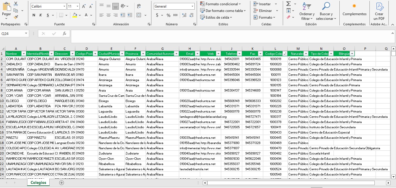 Completa Base de datos de 33.160 Colegios de España organizados en formato excel, con todos sus datos de contacto.