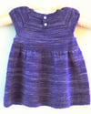 It is a simple baby dress with puffed sleeves, knit from the top down, mostly in the round. There are little pearl buttons and a bow added afterwards.
