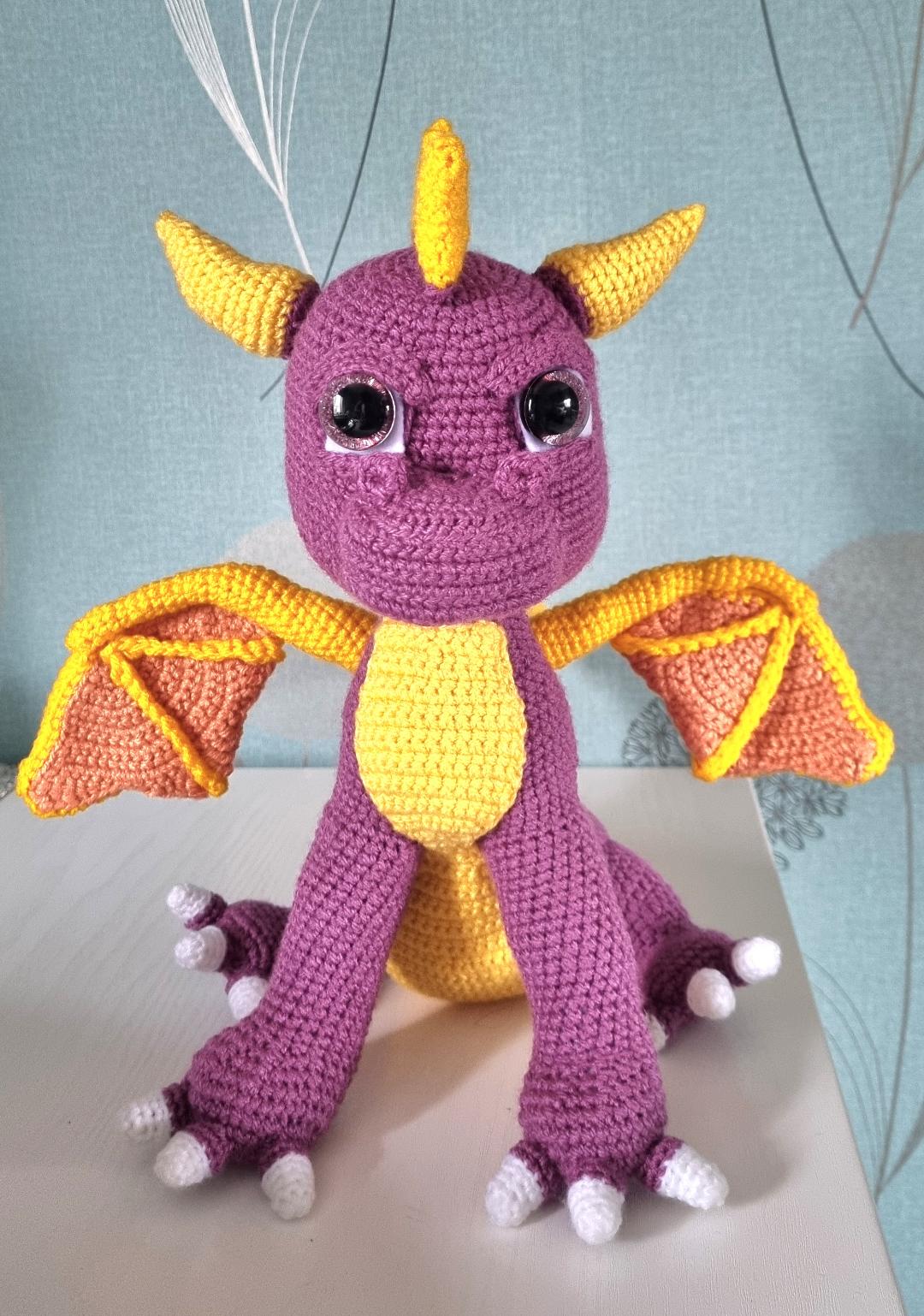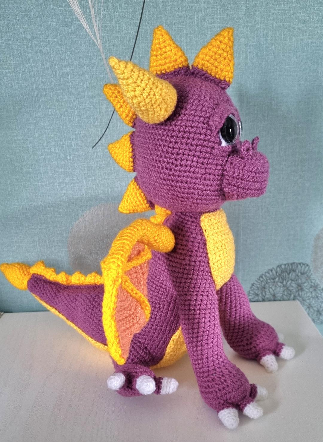 We would like to introduce to you 'Sparky The Dragon' He is inspired by the video game dragon 'Spyro' , He is worked in basic stitches and rounds, is worked in DK (8PLY Worsted) Yarn, and stands at approximately 12" in height,