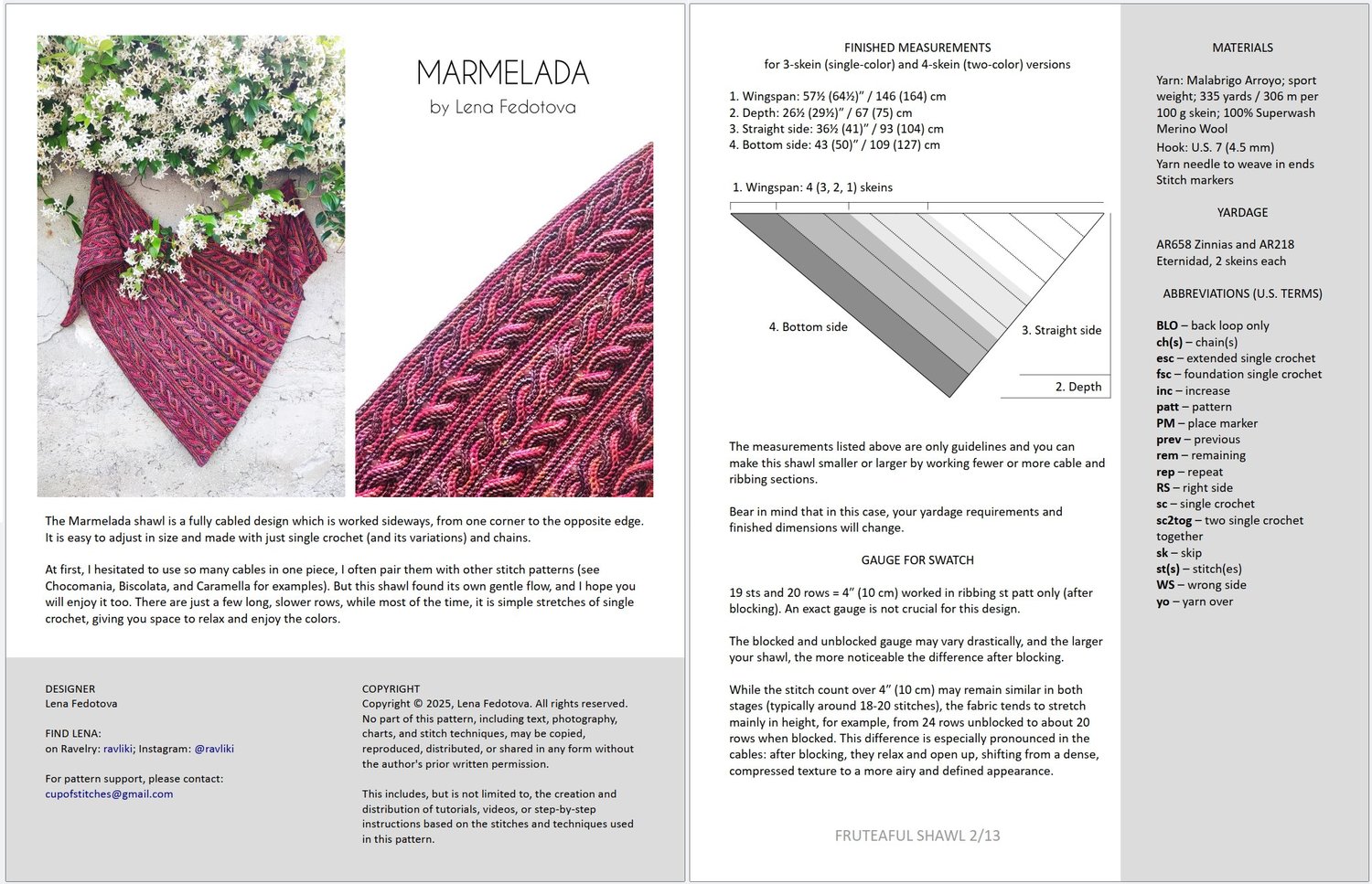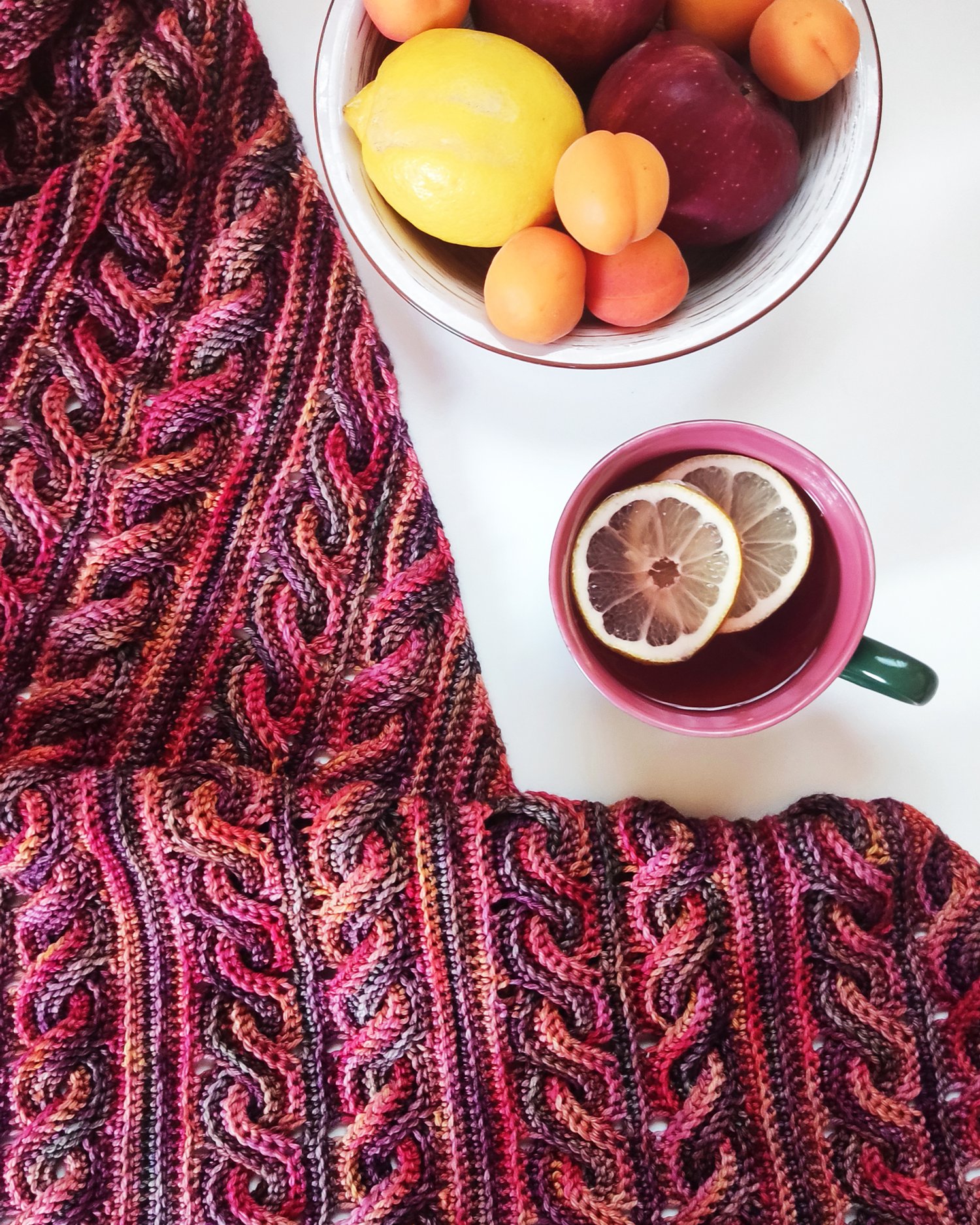 The Marmelada shawl is a fully cabled design which is worked sideways, from one corner to the opposite edge. It is easy to adjust in size and made with just single crochet (and its variations) and chains.