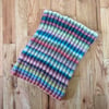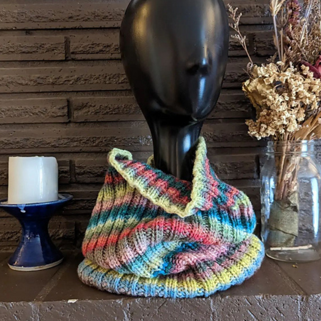 This is almost the simplest of simple cowls, designed to get a new knitter comfortably alternating between a knit stitch and a purl stitch. Designed to use up all of a single skein of Berroco Wizard, it makes a long cowl that can be worn scrunched up, or folded over for a doubled (or mock turtleneck) look. A self-striping or gradient yarn will keep the 2x2 ribbing intriguing as the cowl grows.