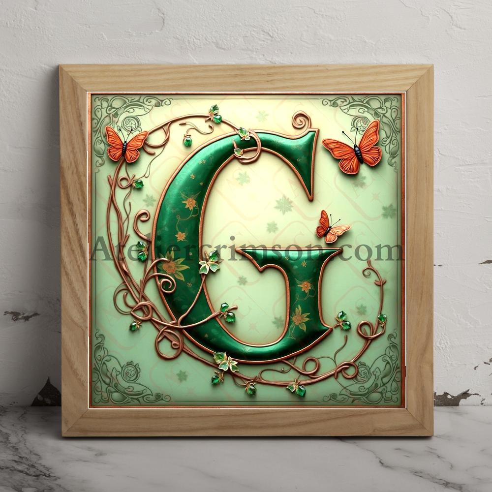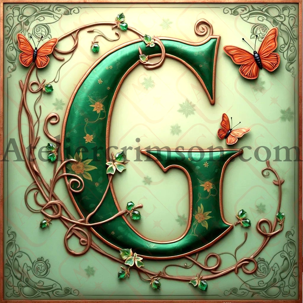 The letter G emerald and copper Art Nouveau Intricate design with floral patterns, butterflies, and vines. Elegant sage green background. Perfect for vintage lovers and typography enthusiasts.