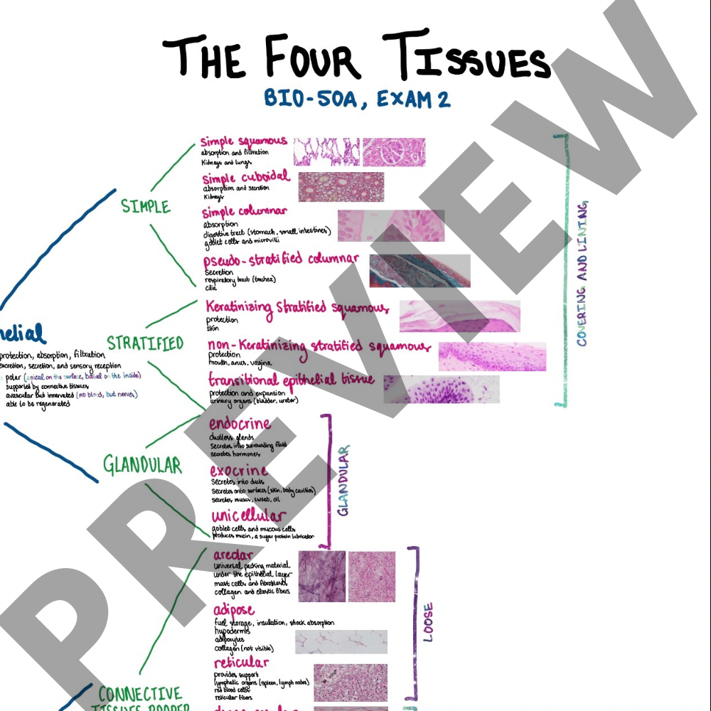 Study material for Exam 2 (Tissues). Flowchart of the four types of tissues (epithelial, connective, muscular, and nervous). Includes histology, function, and organ location for each tissue.