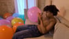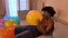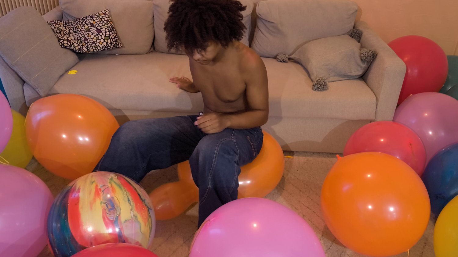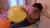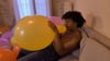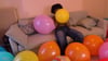 After that he try to burst a second punch balloon by sitting on it.