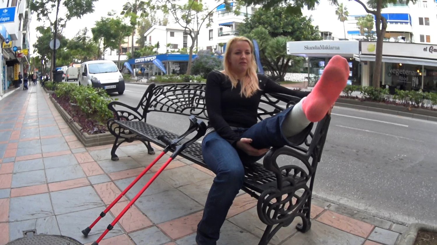 With CLC under his jeans, Alva is crutching along the streets of Spain.After a while she sits down on a bench to rest and it looks really funny when her leg point straight out from the bench.She continues crutching and comes to a shop where she plans to shop.We hope that everything goes well and that Alva does not roll down any bottles.