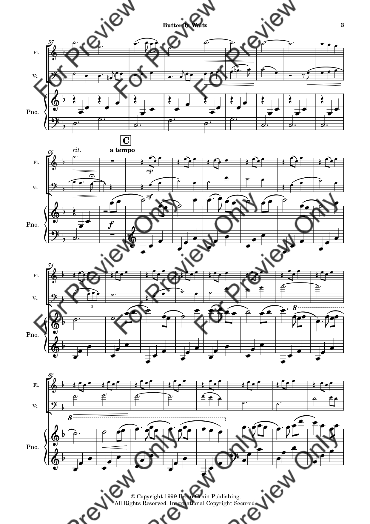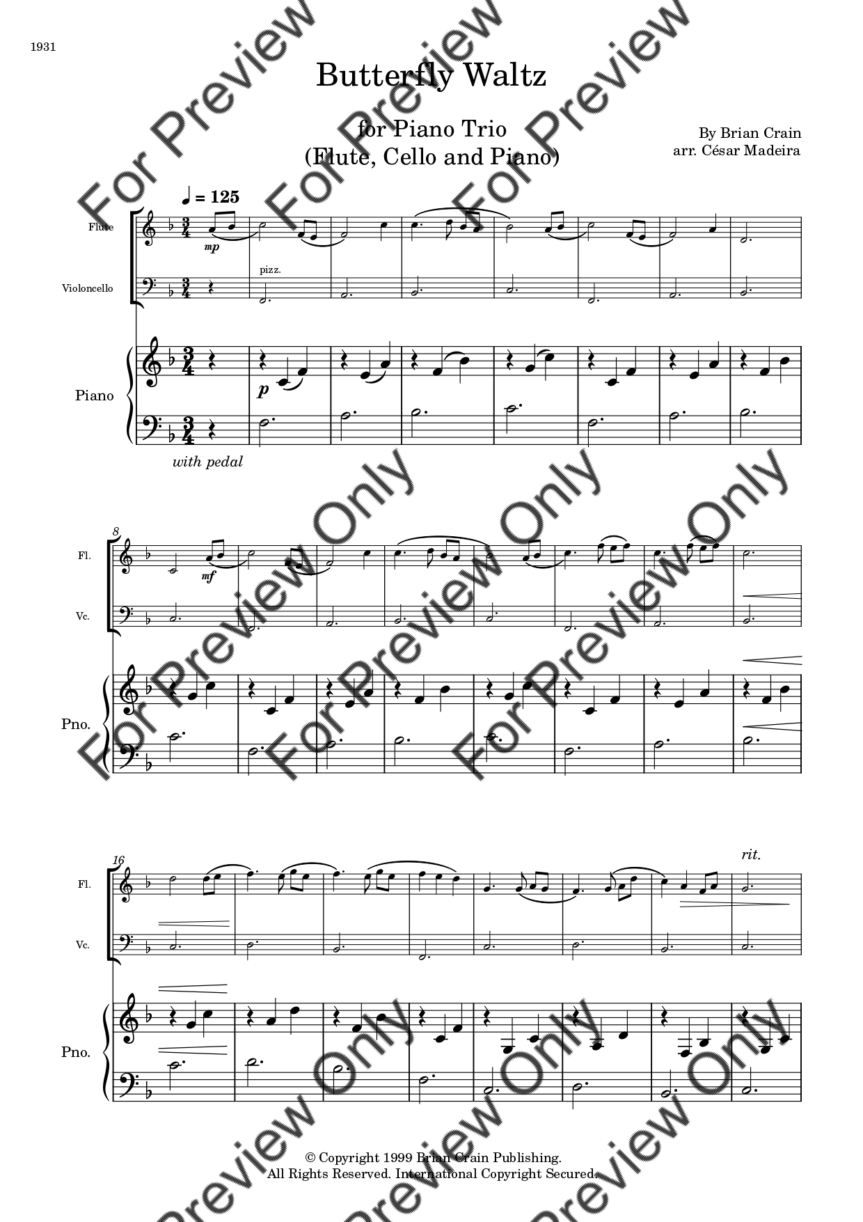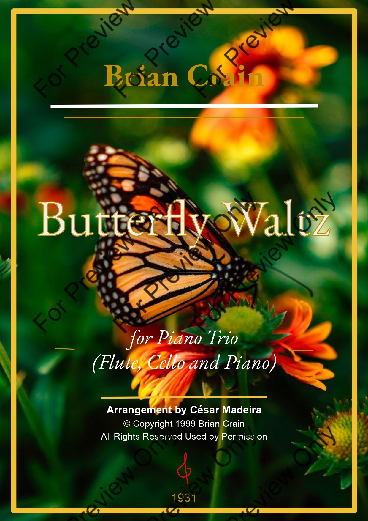 Butterfly Waltz by Brian Crain. Arrangement for Flute, Violoncello and Piano. With Full Score and Individual Parts. Have fun!