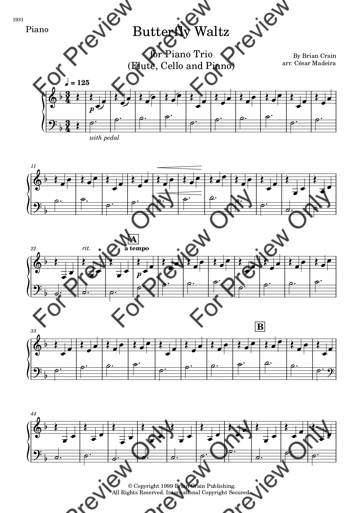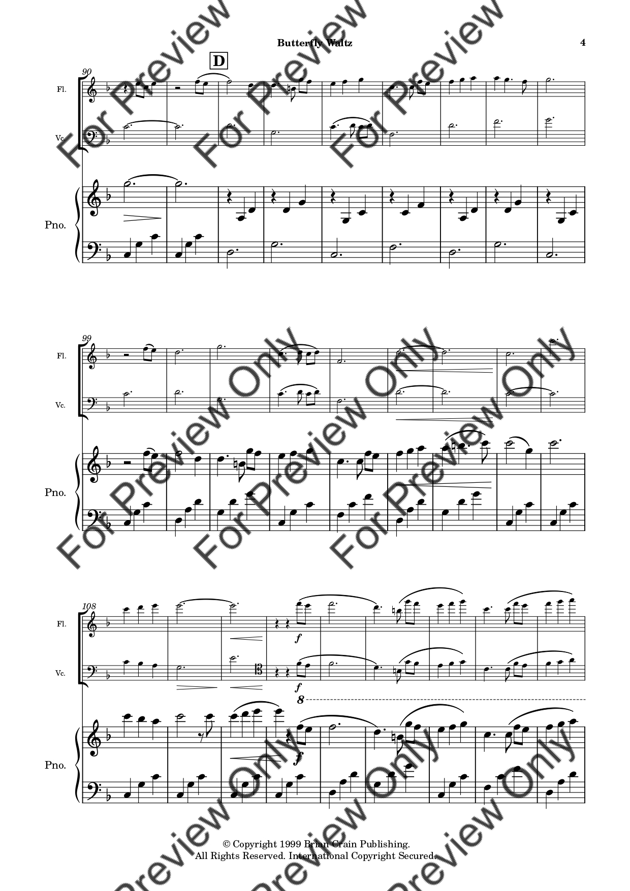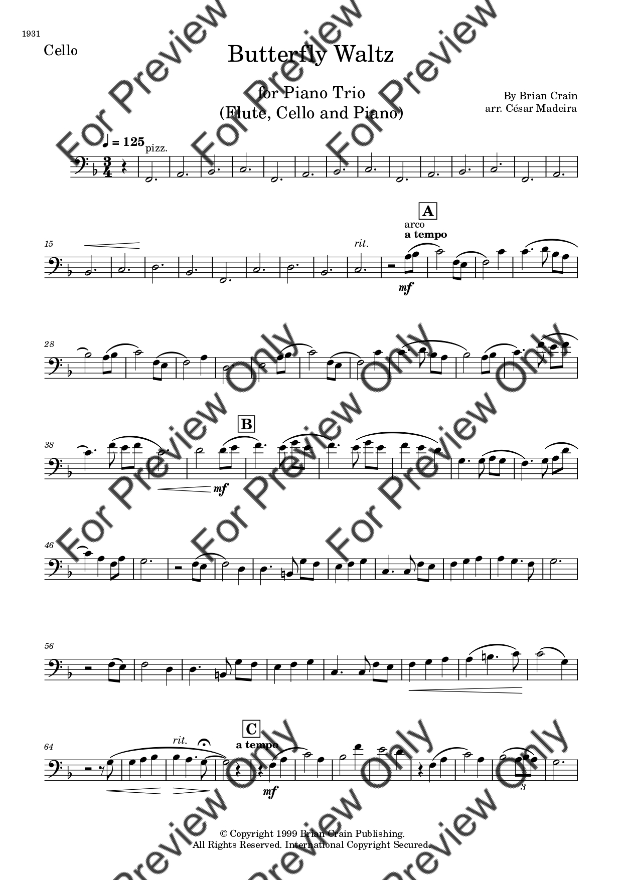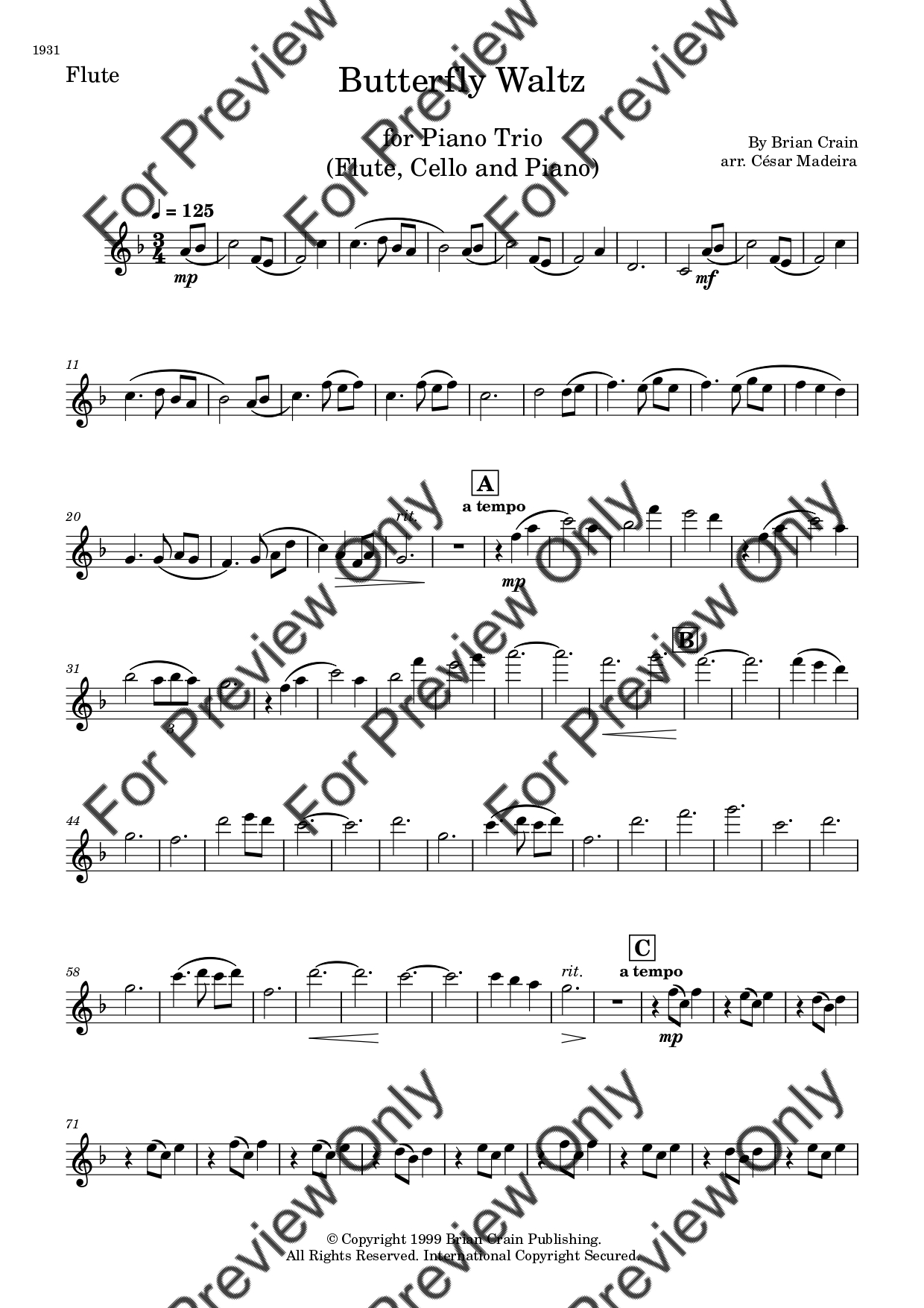 Butterfly Waltz by Brian Crain. Arrangement for Flute, Violoncello and Piano. With Full Score and Individual Parts. Have fun!