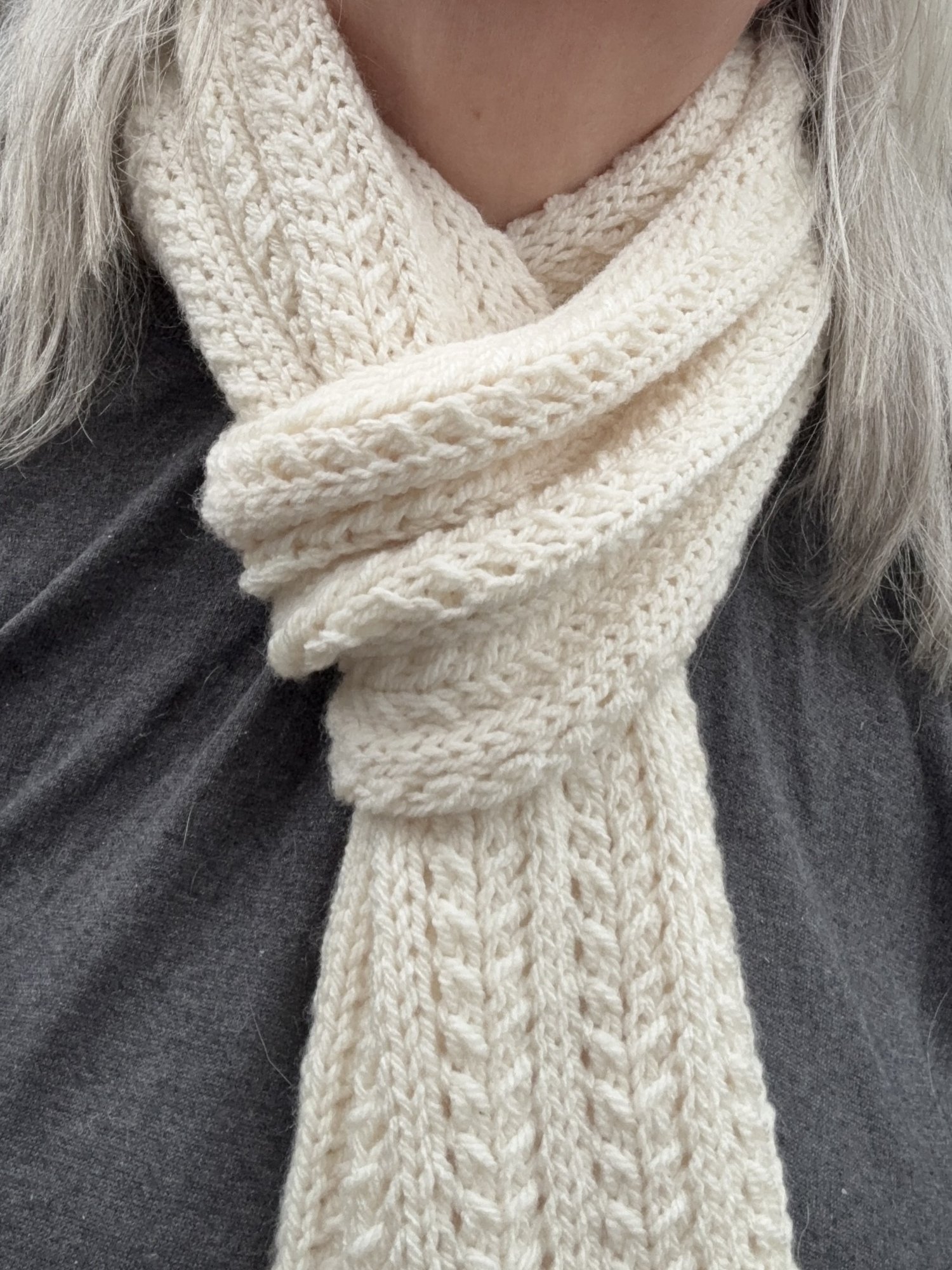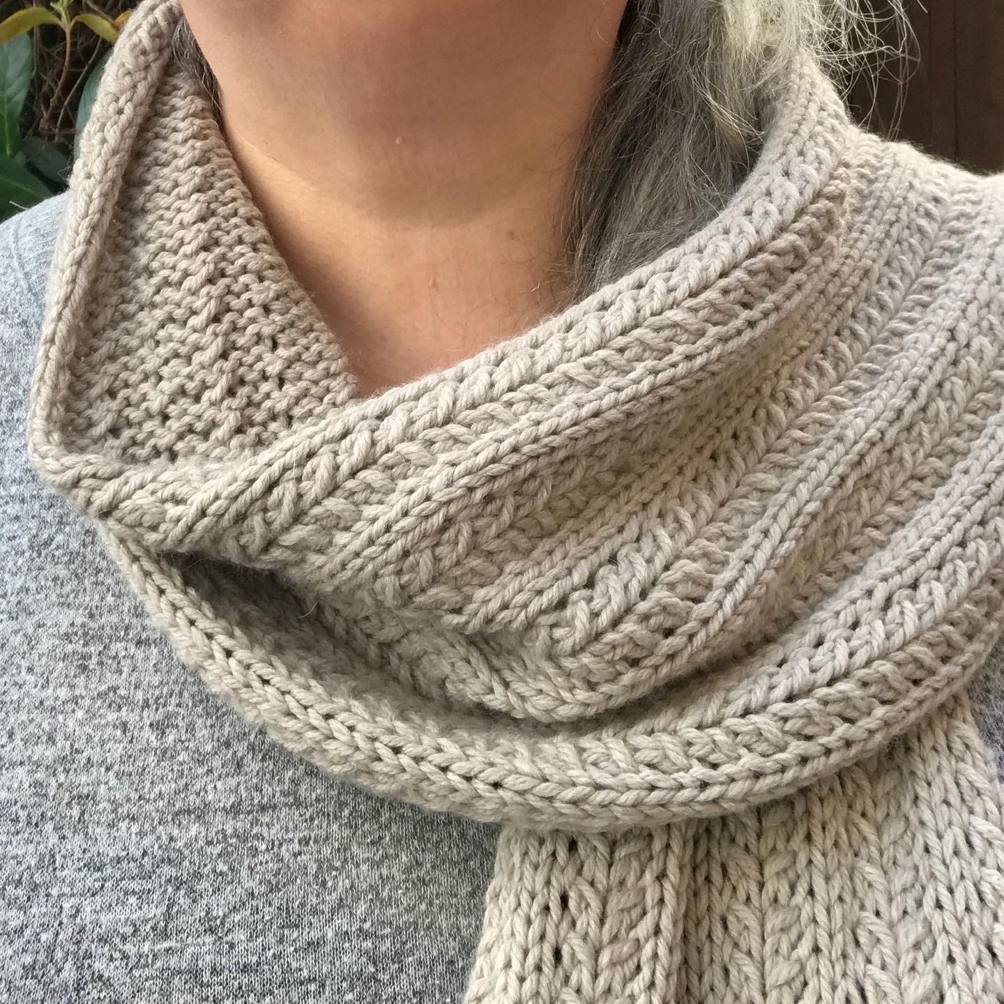 Chunky scarf version: Rico Design Mega Merino Chunky: 55% Wool/45% Acrylic (125m per ball) in Ecru and Anthracite.