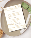 un faire-part sobre aux détails dorés, un menu raffiné, et des noms de table assortis pour sublimer votre réception.