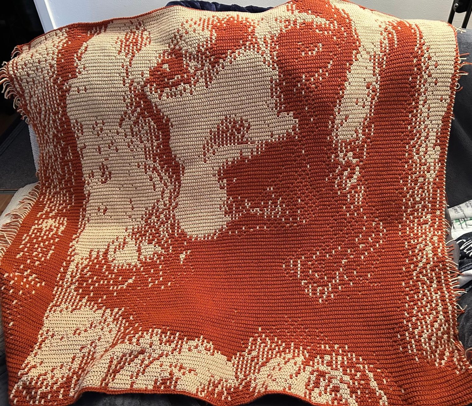 For this pattern, my tester Debs Taylor Bryant used a 4mm hook and the measurements with the recommended yarn (Stylecraft special DK) were 125 cm wide X 122 cm high (49.2126” w X 48.0315” h), WITHOUT BORDER, ideal for a sofa Blanket