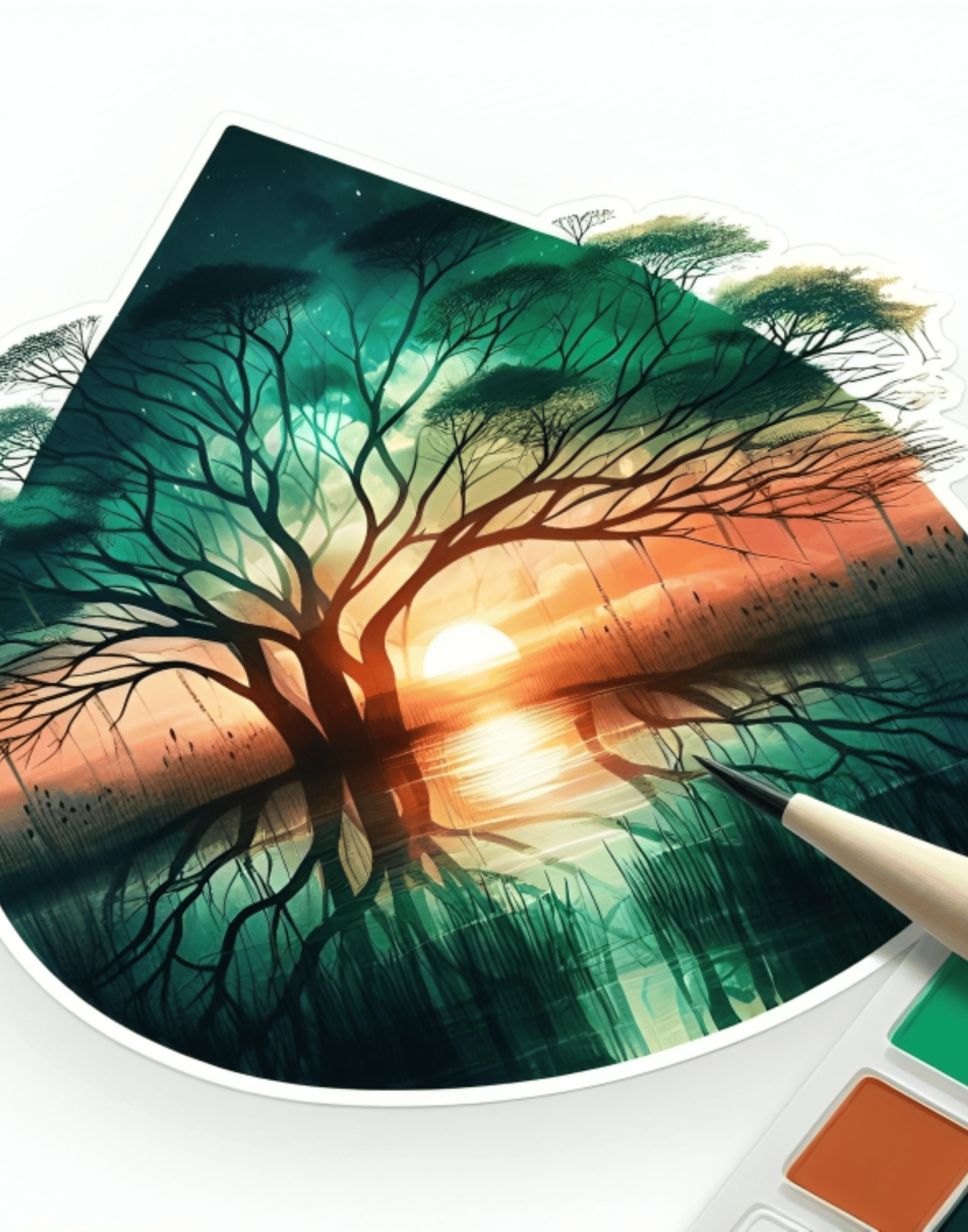 Japanese Watercolor Ink Painting, Japanese Sunset Painting, Tree Painting, Red Sun Painting, River, Mountain, Vintage Village, Top Art, Nostalgic Rural life, Nature, Cool Nature, Beautiful Nature, Sunrise, Natural Landscape, Wall Art, Digital Art.