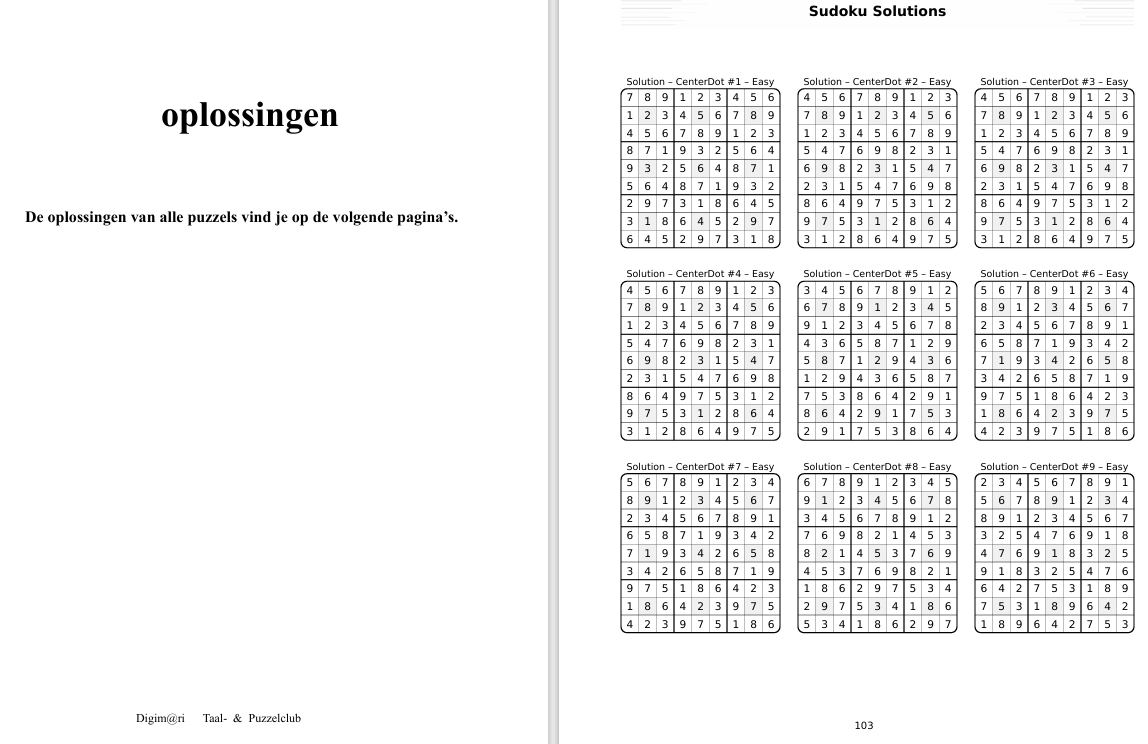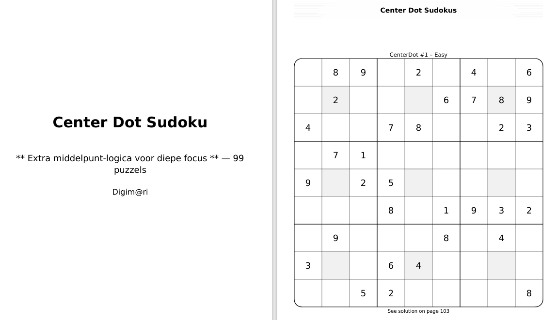 Een compacte editie met 99 Center Dots‑puzzels, printbaar op A4.