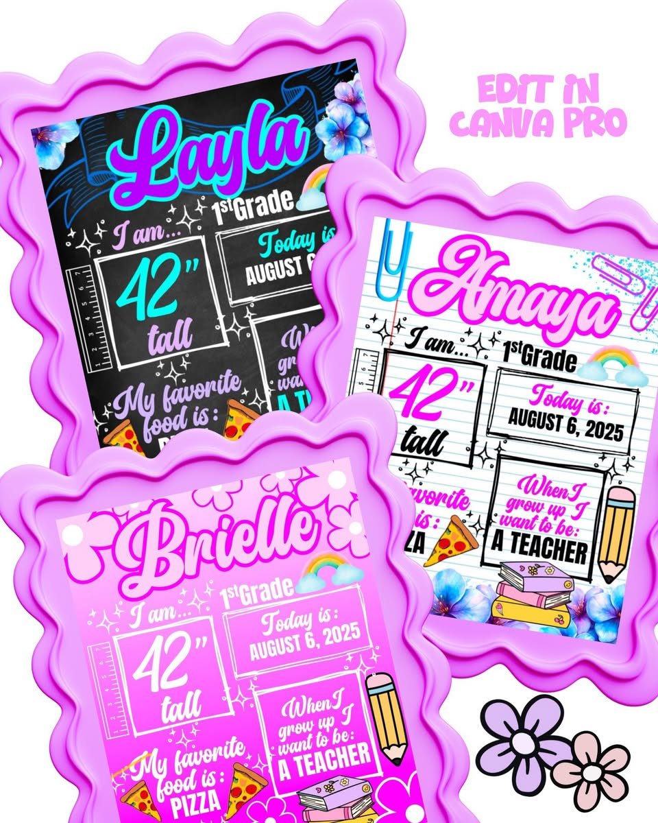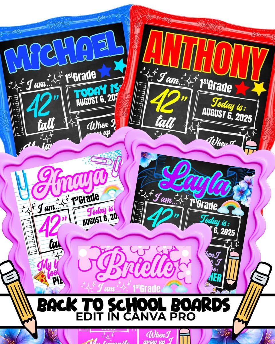 Capture the first day of school in style! This Back to School Board Template Bundle is fully editable in Canva Proso you can personalize with your child’s name, grade, height, favorite things, and more. Print at home or through a print shop for a keepsake your family will treasure year after year.