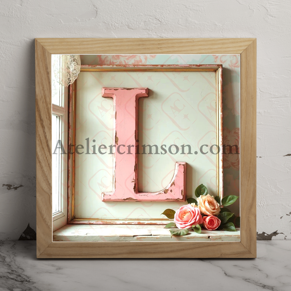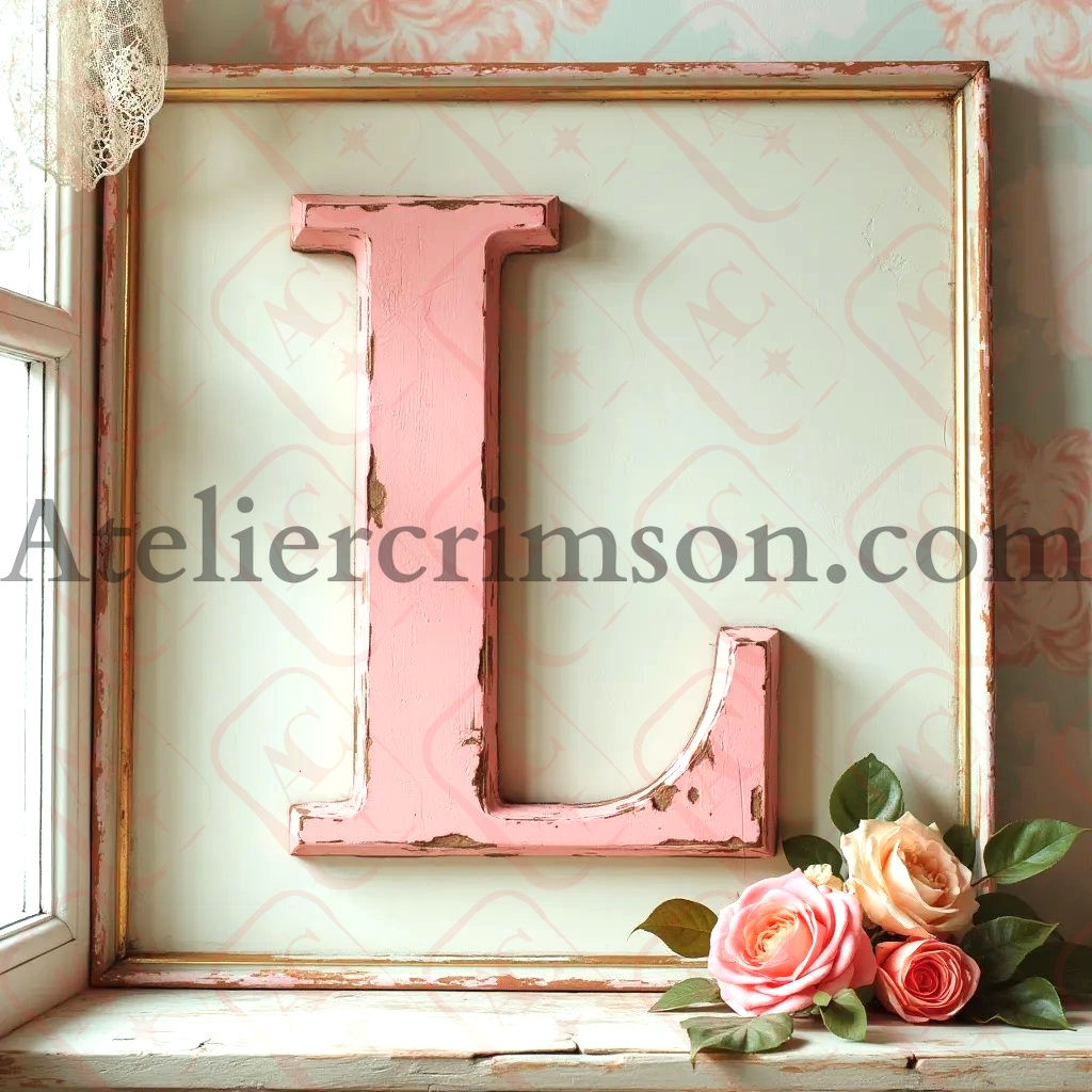 The letter L pink and shabby chic This charming series presents the alphabet reimagined in a delightful shabby chic style. Each letter is crafted from weathered pink wood, standing proudly against a soft cream background. The collection exudes a romantic, vintage atmosphere with its elegant typography and subtle decorative elements.