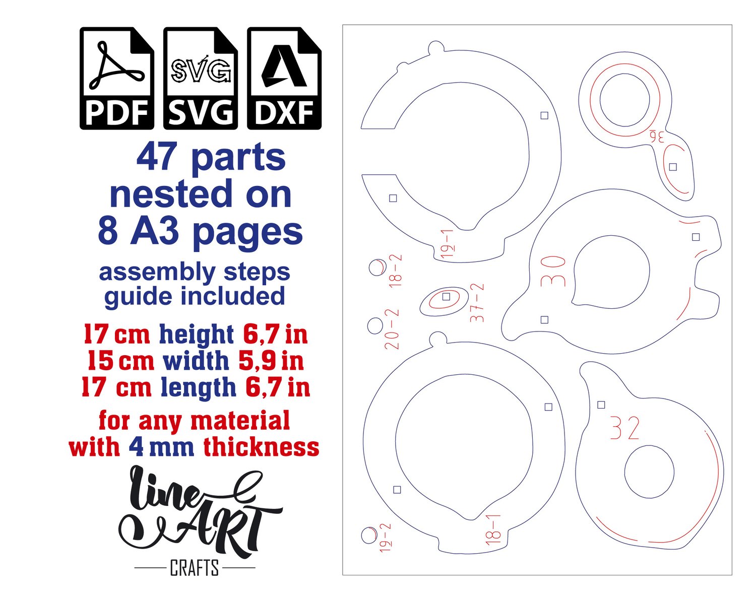 - PDF, SVG and DXF files with 47 parts nested on 8 A3 pages for 4mm thick material.