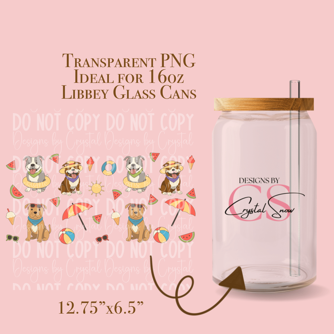 This Summer Pitbull Libbey Glass Can Wrap PNG is a high-resolution 300 DPI transparent PNG — sized perfectly for 16oz Libbey glass cans! Featuring playful pitbull pups, watermelon, beach balls, sunglasses, and more — ready to bring sunshine and puppy love to your drinkware creations.