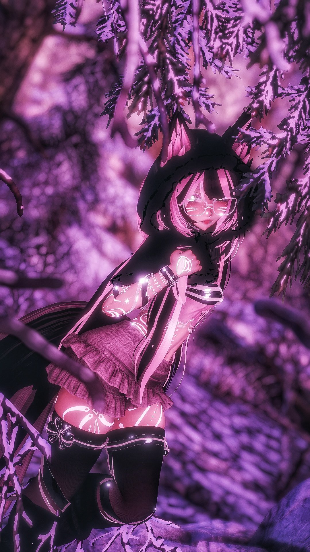 Additional Things: Hand drawn Icons, Idle animations (Tail), Ear movement (with face tracking and gestures), Blink Idle animation, Custom Index + Facial gestures, Several Scratch / handmade assets, Toon Standard quest materials + matcaps, improved thigh physics (Jiggly and squishable), Avatar limb scaling system, Avatar lighting radial system.