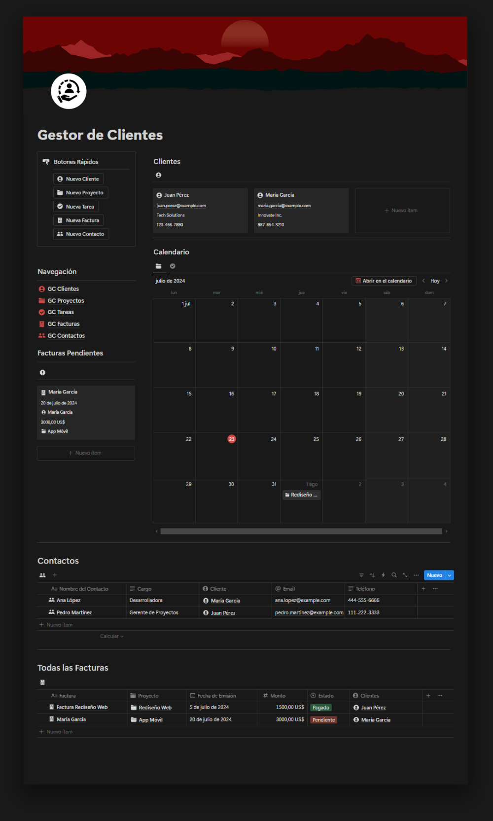 ¿Quieres llevar la gestión de tus clientes al siguiente nivel? Nuestra plantilla de Notion para la gestión de clientes es la herramienta definitiva para mantener todo en orden y aumentar tu productividad. Diseñada para profesionales que buscan una solución integral, esta plantilla te permite administrar todos los aspectos de la relación con tus clientes de manera eficiente y organizada.