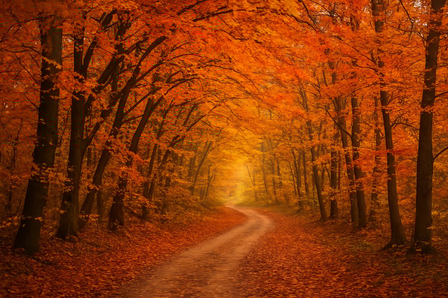 A scenic winding road leads through a dense forest covered in vibrant orange and golden leaves. The warm autumn light filters through the trees, creating a peaceful and atmospheric landscape filled with seasonal beauty.