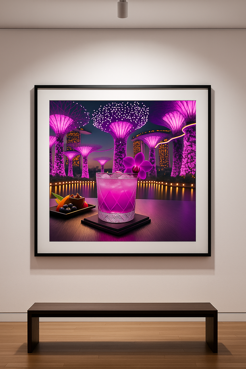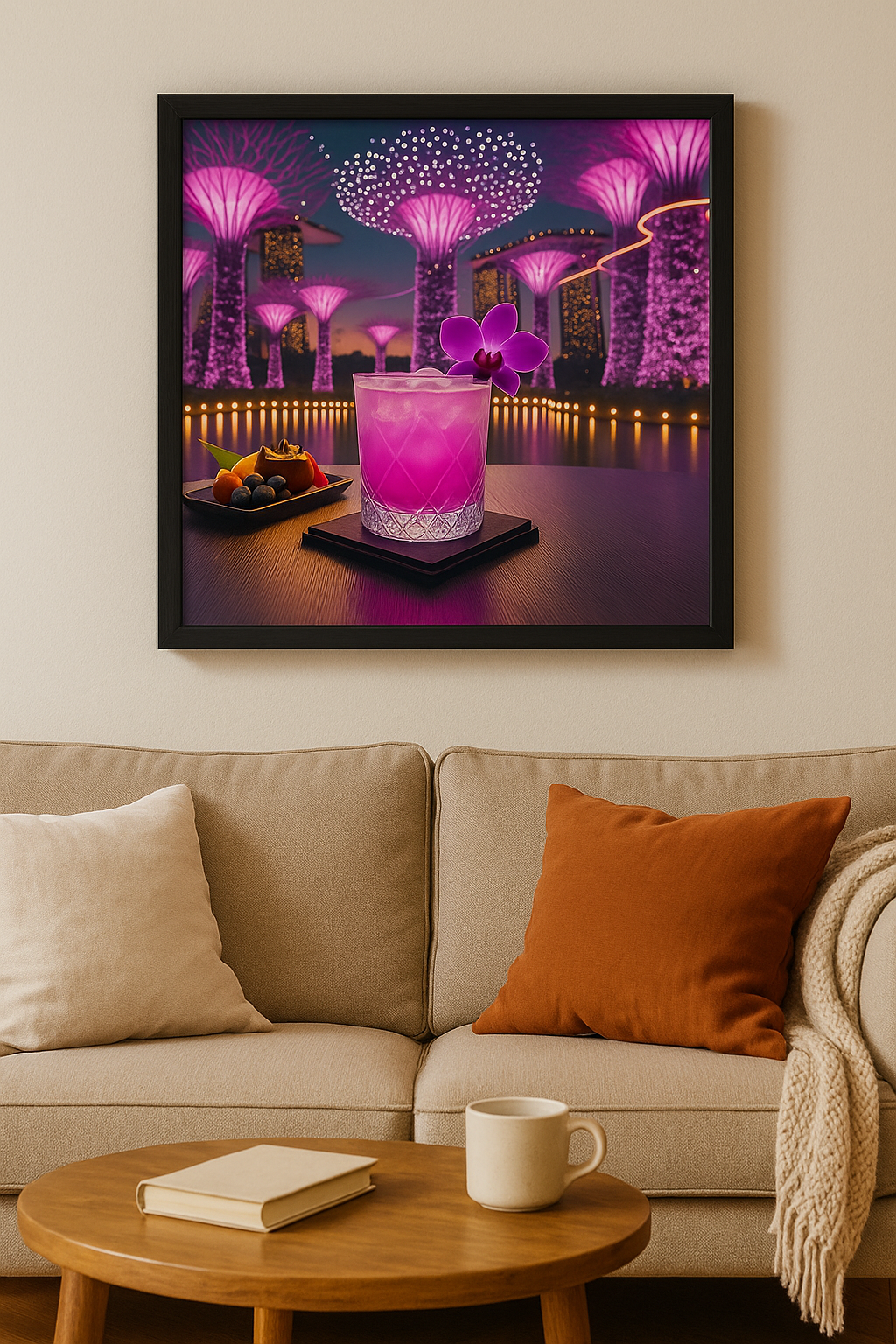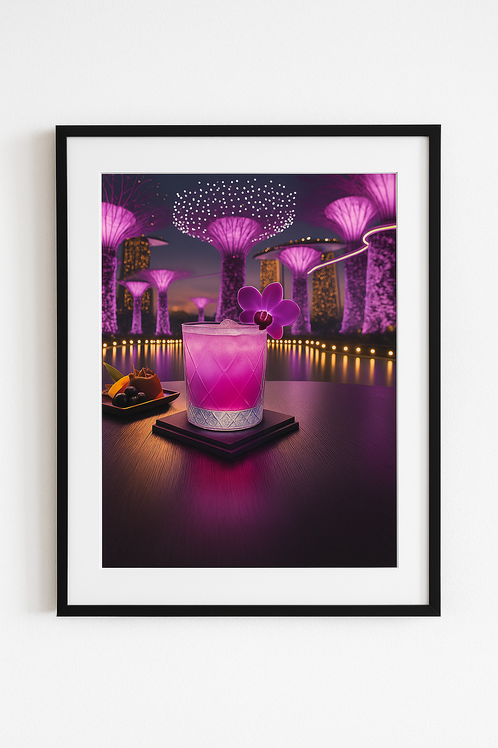 Bring home the magic of Singapore’s Gardens by the Bay with this vibrant digital art print. Featuring the iconic Supertree Grove glowing in twilight hues, this artwork captures a dazzling purple orchid cocktail in the foreground against a dreamy skyline. Perfect for lovers of travel, culture, and modern décor.