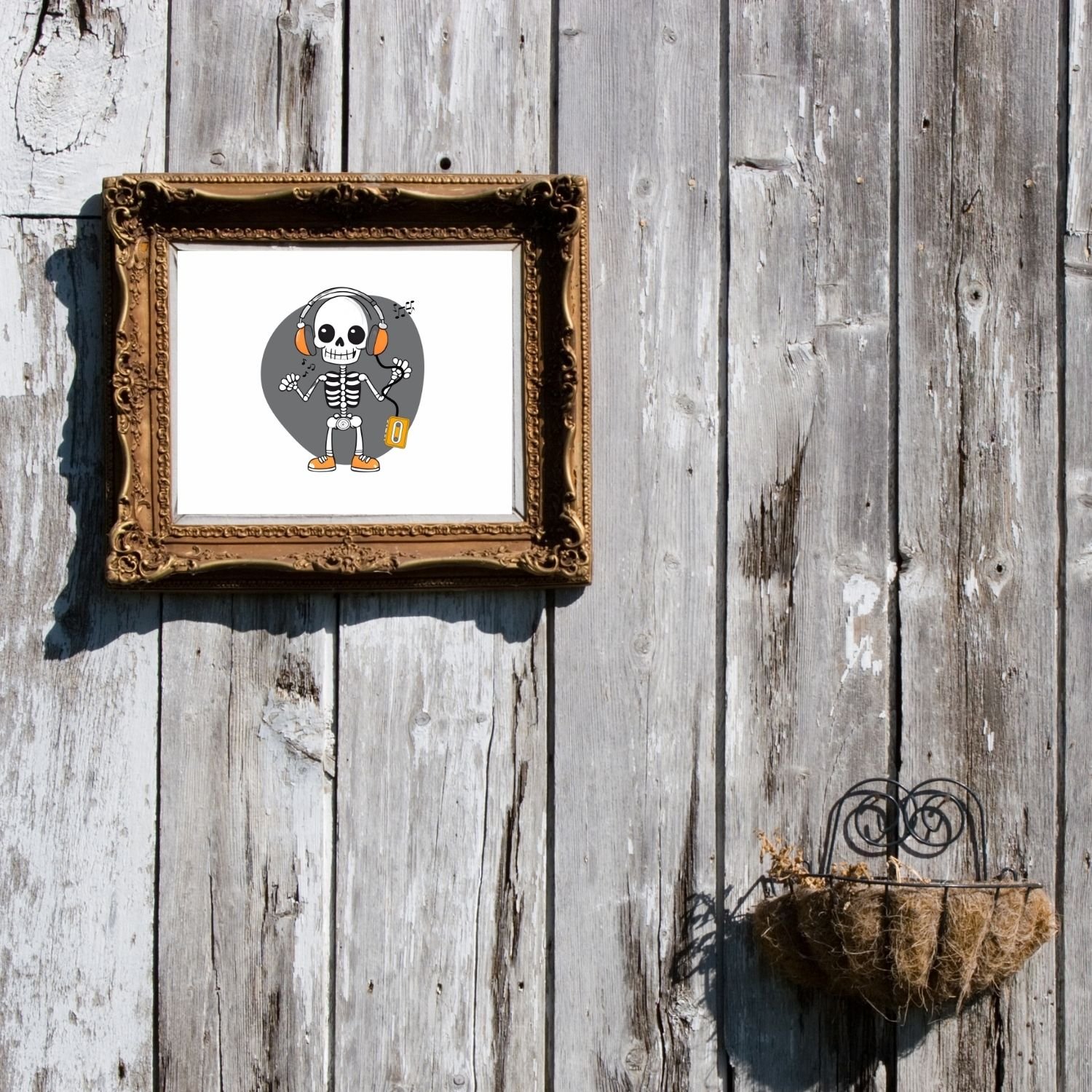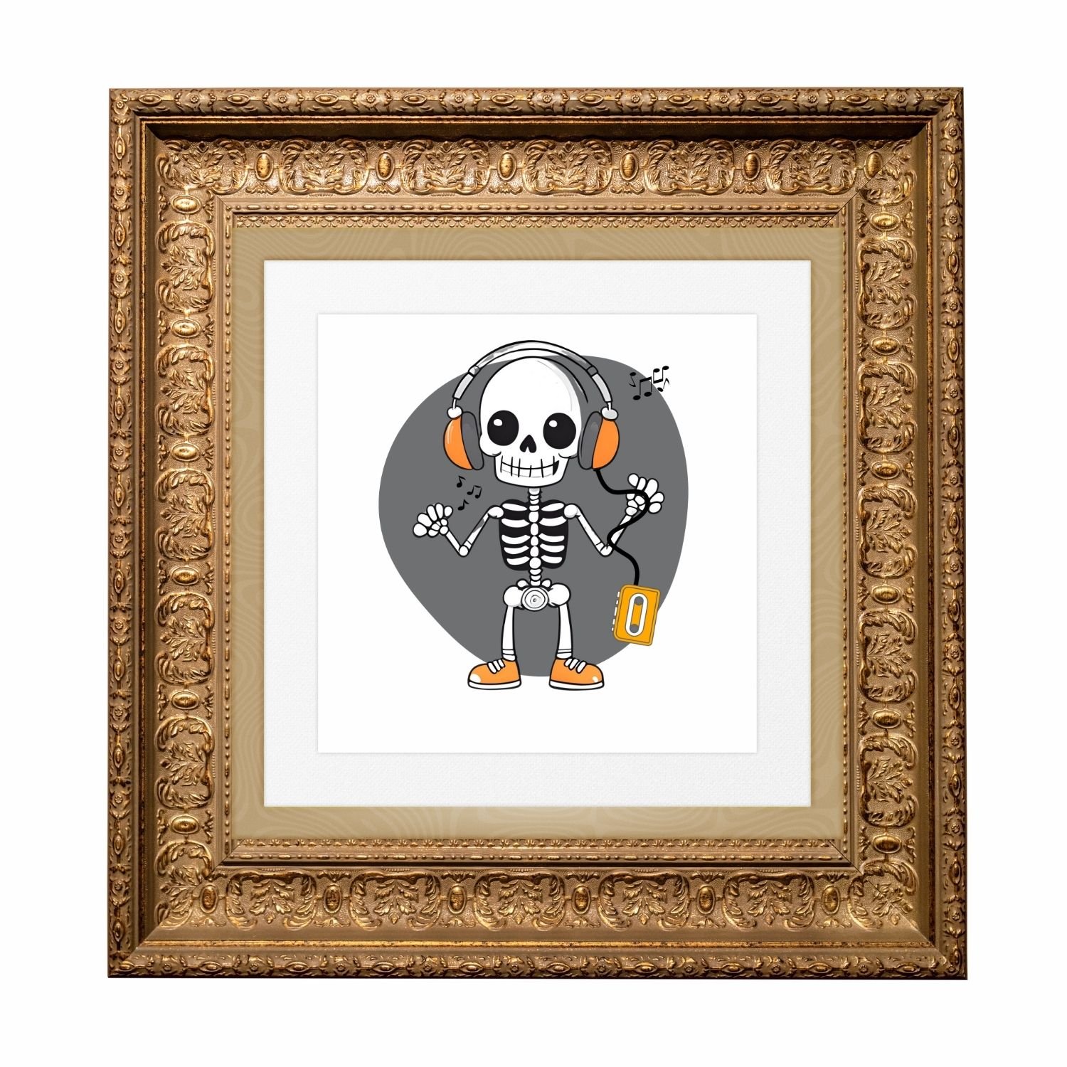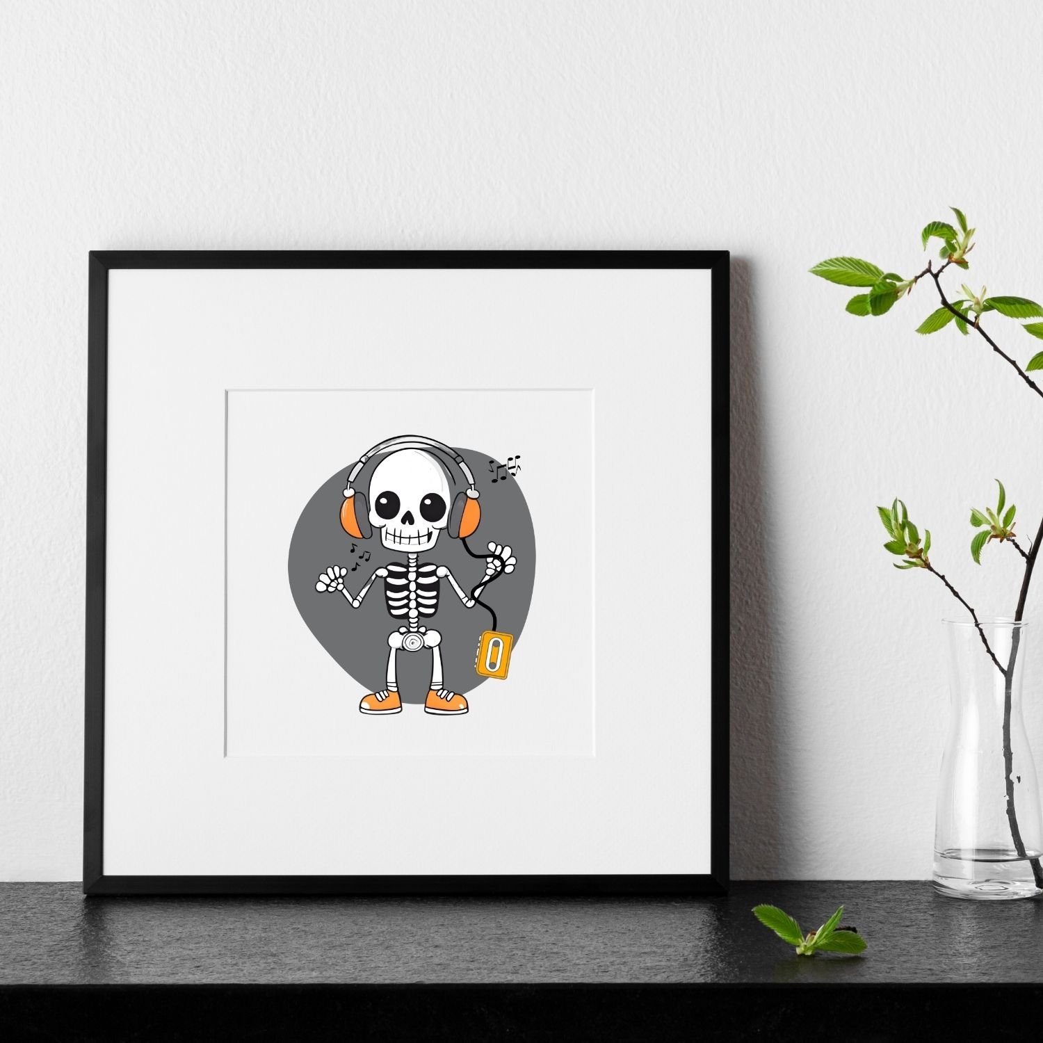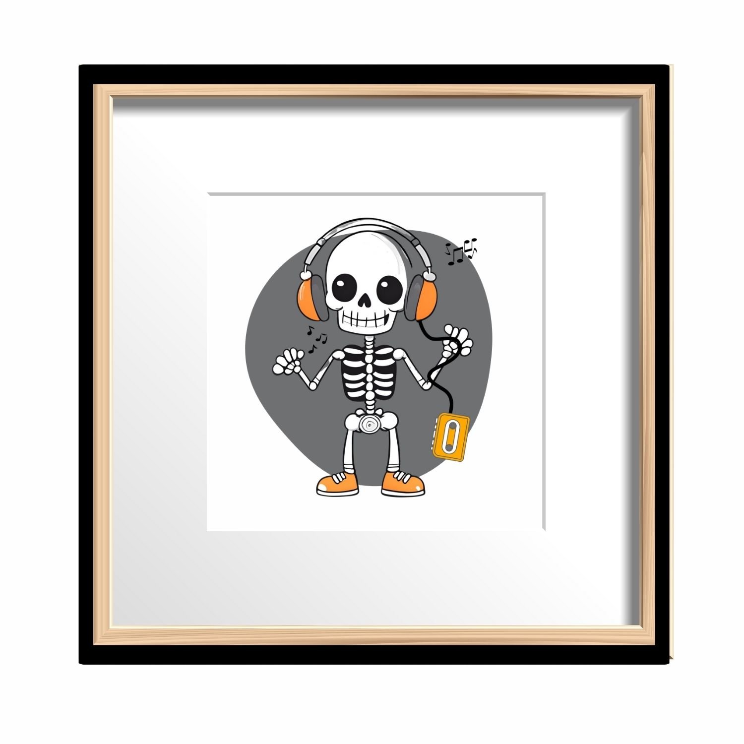 Keywords: skeleton, music, walkman, orange sneakers, retro, funny, comical, vintage, 80s, 90s, nostalgia, fashion, style, street style, hipster, urban, cool, trendy, unique