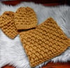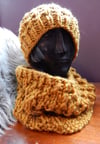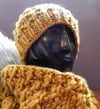 Demeter’s Hat is named after Demeter, the goddess of agriculture and also referred to as “the pure mother bee,” as the texture resembles honeycombs. Pictured with Demeter’s Cowl in Eco-Luxe color Gold (022).