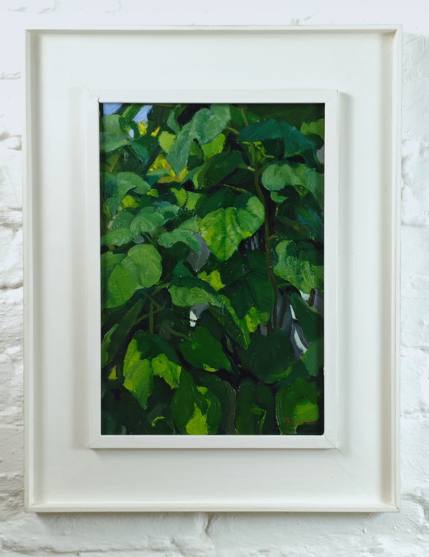 Painted from life in the gardens at Torre Abbey, depicting the Paulownia Tomentosa tree along the Abbey’s south-facing wall. The painting studies light and movement through the canopy of layered leaves.