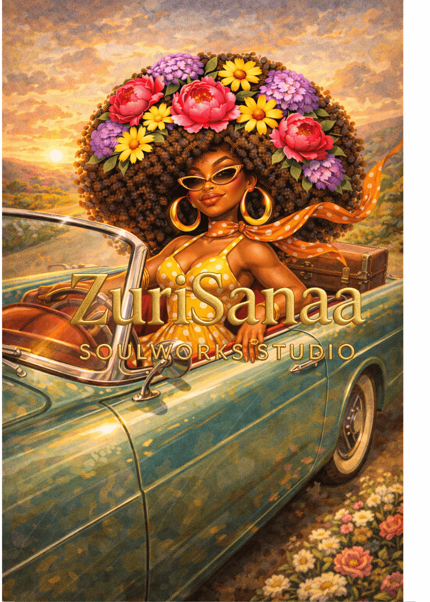 Crowned in Bloom: The Power Muse Collection is a vibrant 10-image PNG bundle featuring bold, confident Black women in powerful lifestyle moments — from runway glam and royal throne energy to poolside luxury, vintage road trips, creative studio vibes, rooftop confidence, and more.