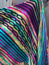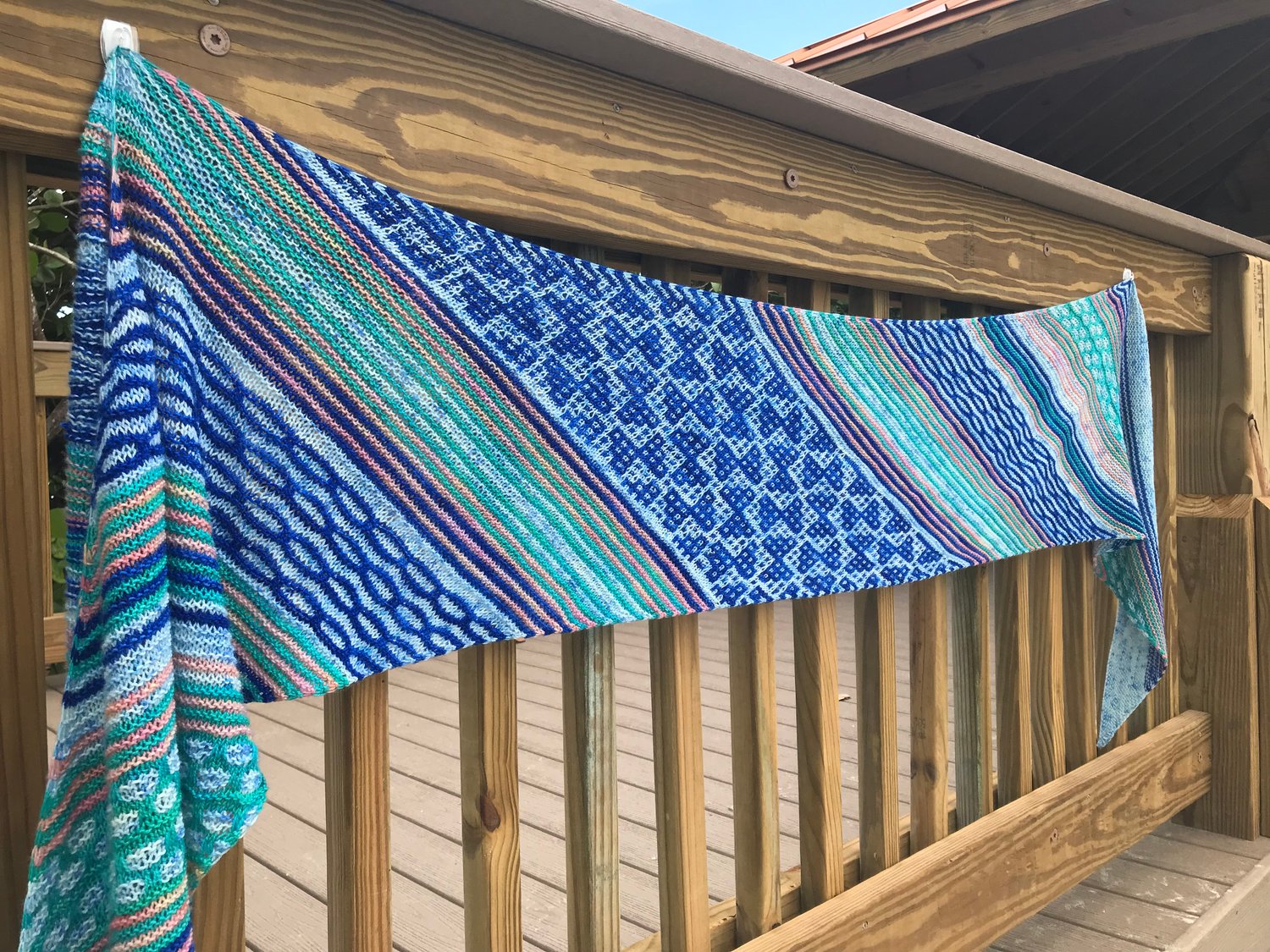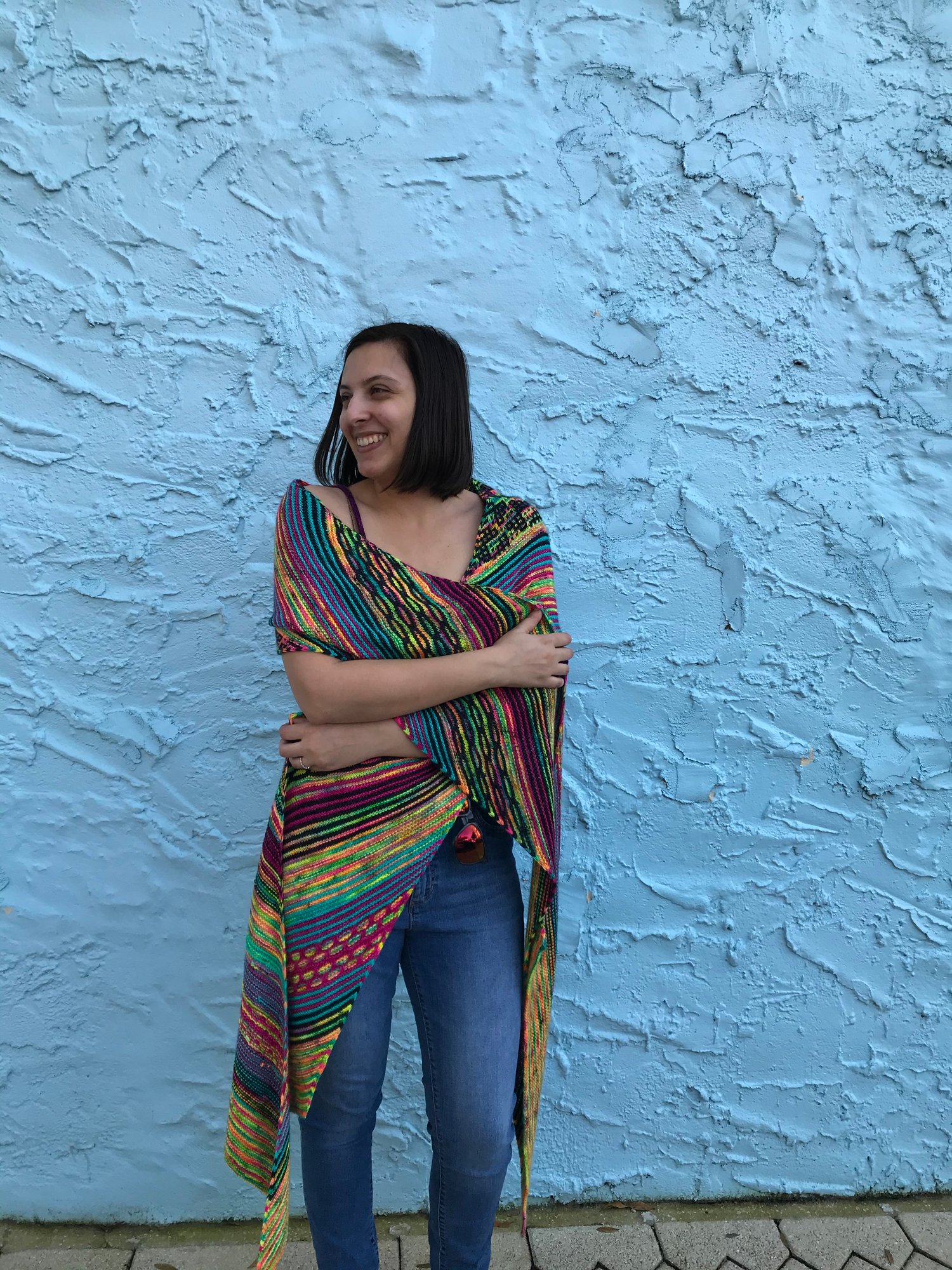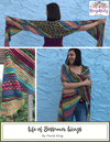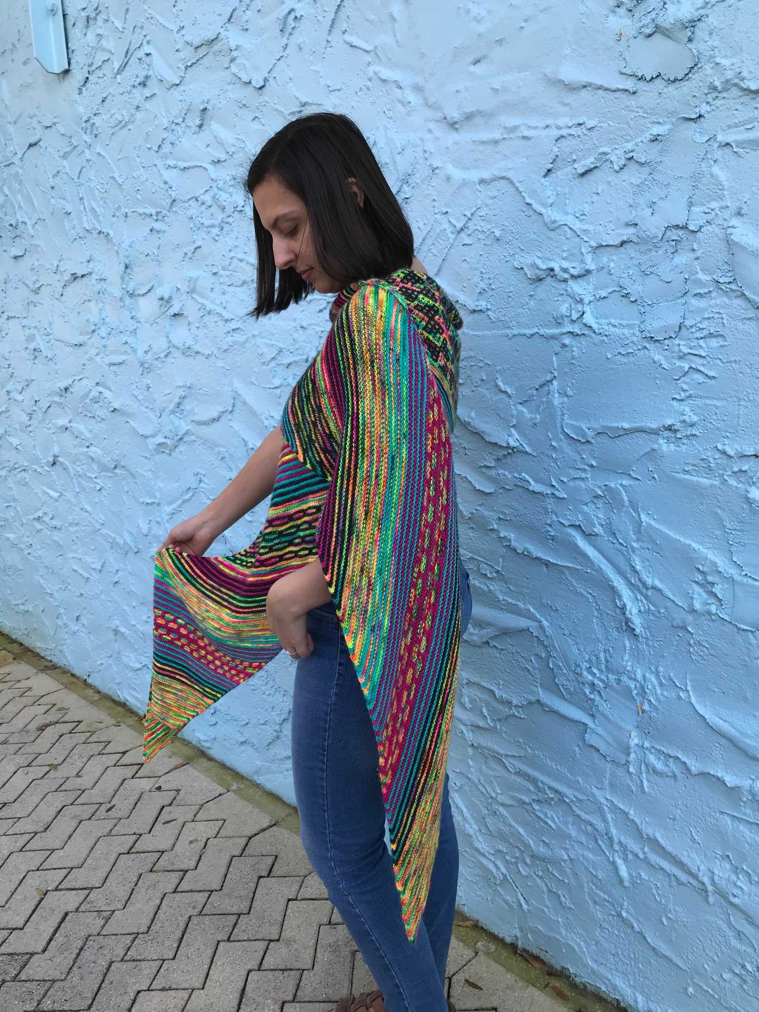 Life of Gossamer Wings is a rectangular wrap knitted on the bias, which means that it is increased and decreased by one stitch every right side row. There are large sections of garter stitch stripes, with slipped stitch and mosaic stitch patterns to keep it interesting. An adventurous beginner will find the slipped stitches easy to memorize, but will keep seasoned knitters interested.