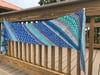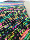 Whimsical Colors 2-ply Bliss (80% Superwash Merino / 20% Nylon, 400 yds / 366m, 3.5 oz / 100g skein); fingering weight. The sample used Blue Seas Confetti, Electric Blue, Strawberry Lemonade and Lagoon.