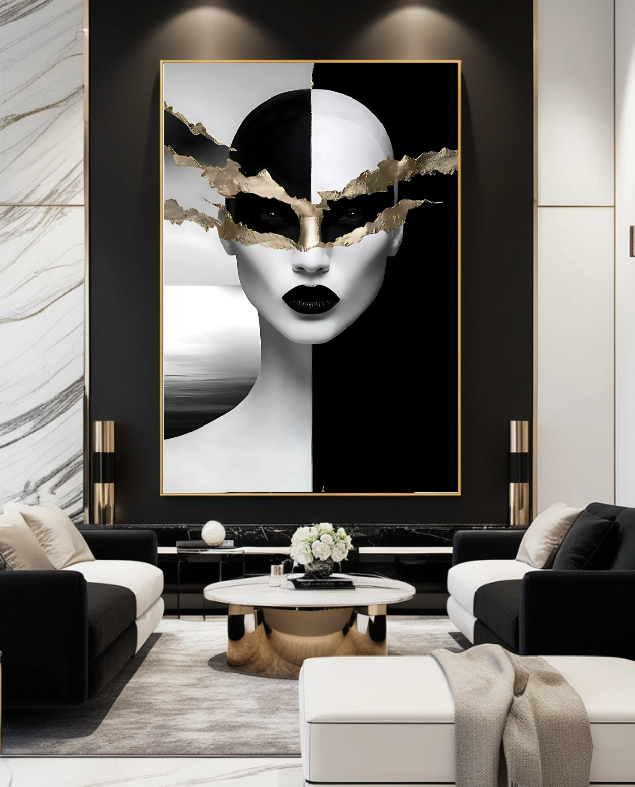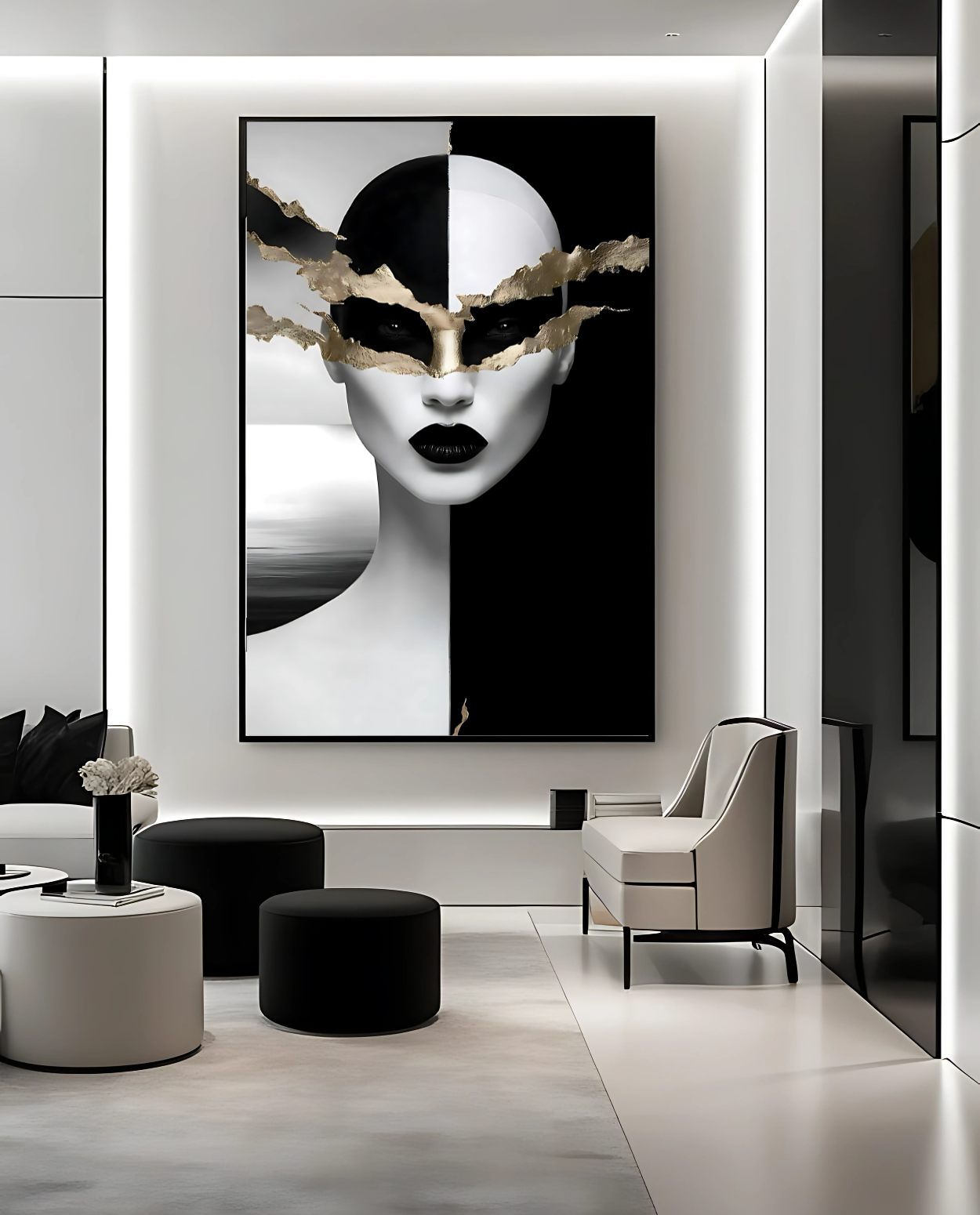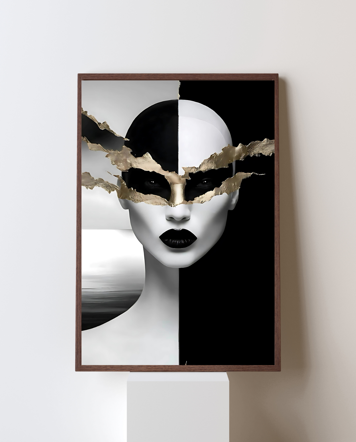 Elevate your space with this striking black and white surreal portrait art, highlighted by luxurious gold accents. Perfect for modern, minimalist, and luxury interiors, this downloadable digital artwork adds bold sophistication to your home, office, or gallery.