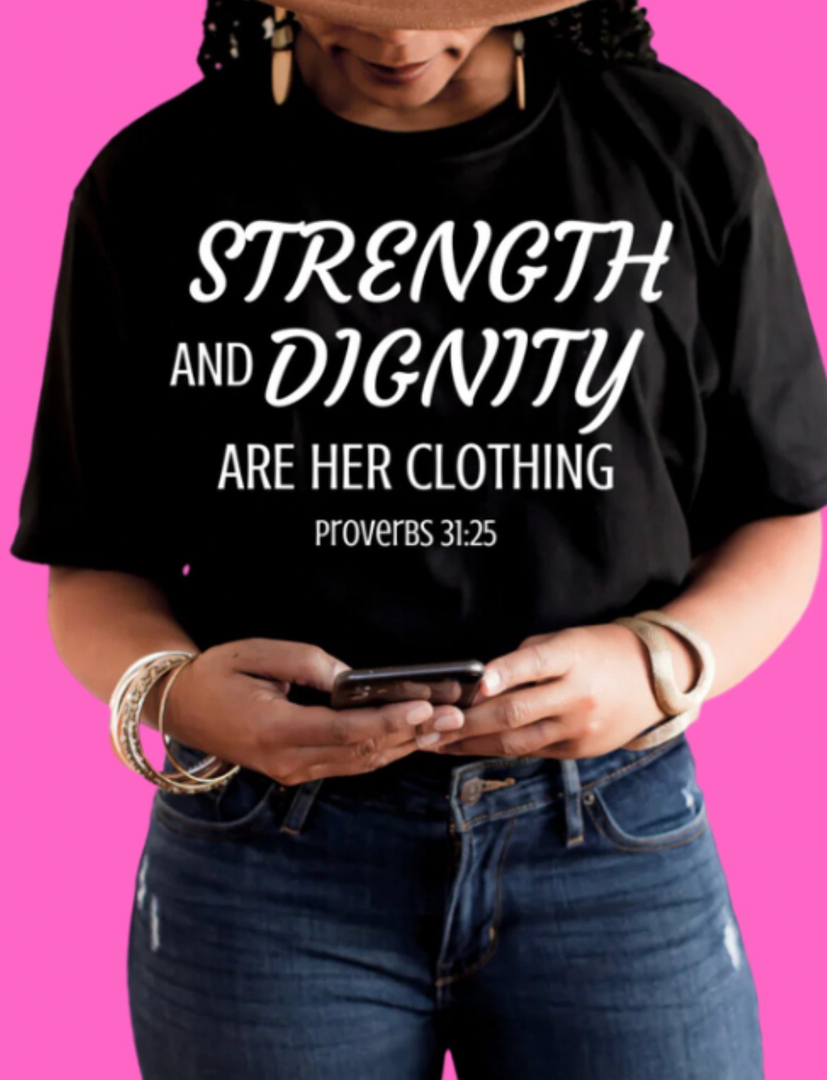 GilDan 50-50 T-shirt, a powerful fusion of strength and dignity inspired by Proverbs 31:25. Elevate your style with this unique tee, available in classic black, white lettering, tailored for a diverse range of sizes from adult small to 5X large, it ensures a comfortable fit for everyone. The impactful statement "Strength and dignity are her clothing" adds a meaningful touch, making this shirt a symbol of empowerment and grace. Embrace the fusion of faith and fashion with GilDan – This tee really tells a story.