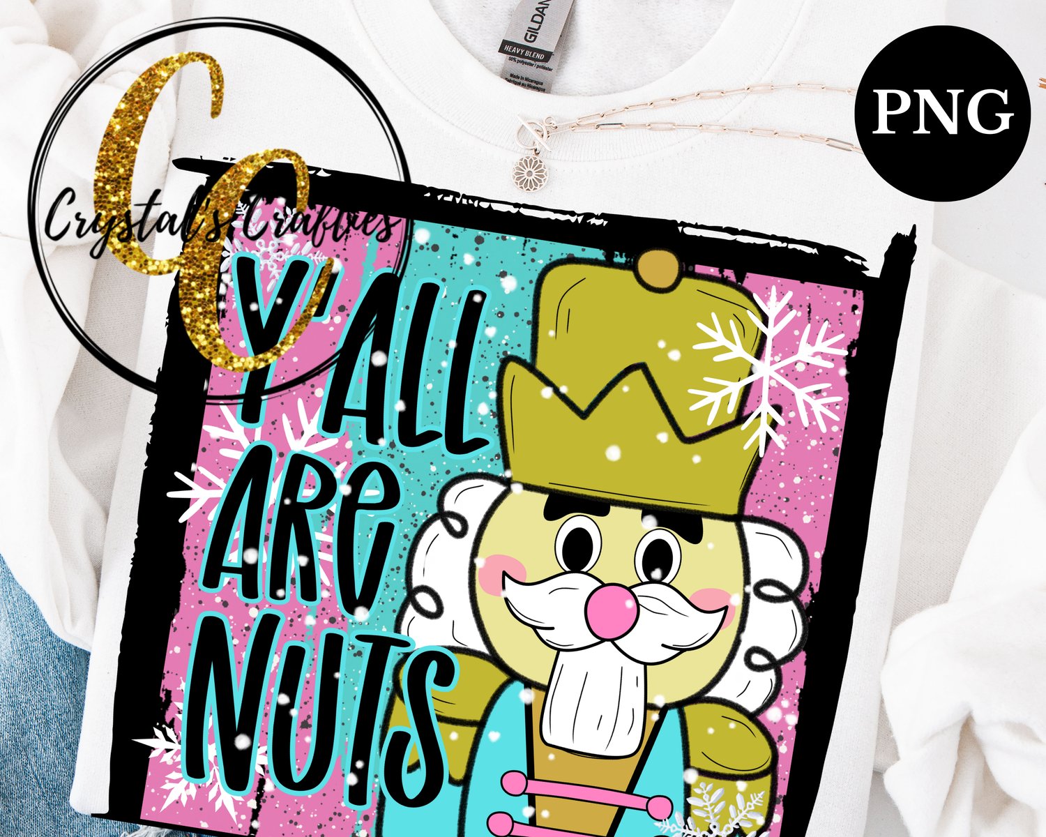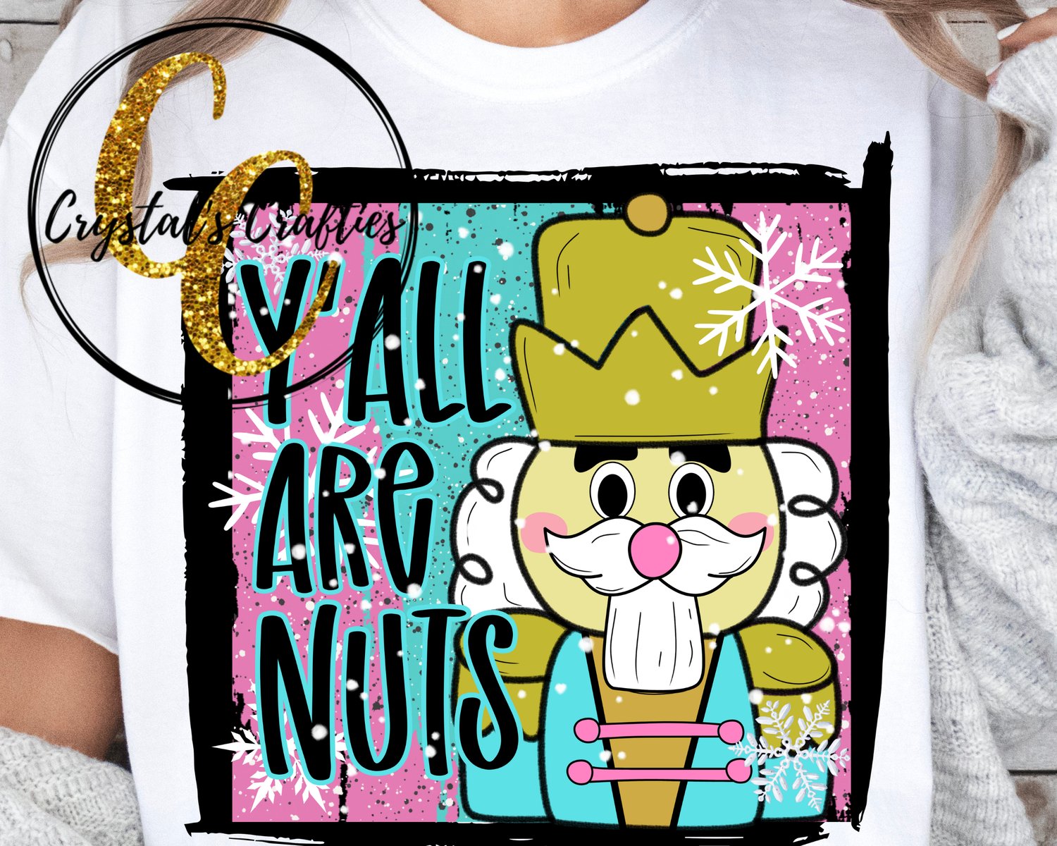Hand-drawn, pastel grunge design featuring Y’all Are Nuts text and a nutcracker character