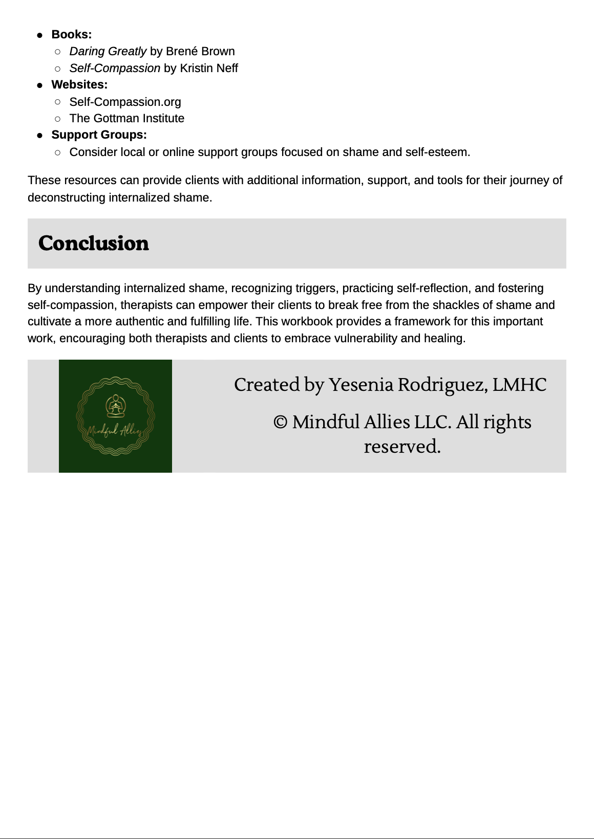 A thoughtful, structured workbook designed to help therapists support clients in identifying, understanding, and transforming internalized shame into self-compassion and personal growth.