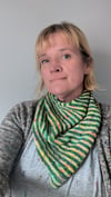 Do you like the idea of a cowl but don’t want the bulk of it around the back of your neck and collar? Then this bandana cowl is perfect. The triangular shape cowl really shows off the yarn with the short ends sewn together at the back of the neck.