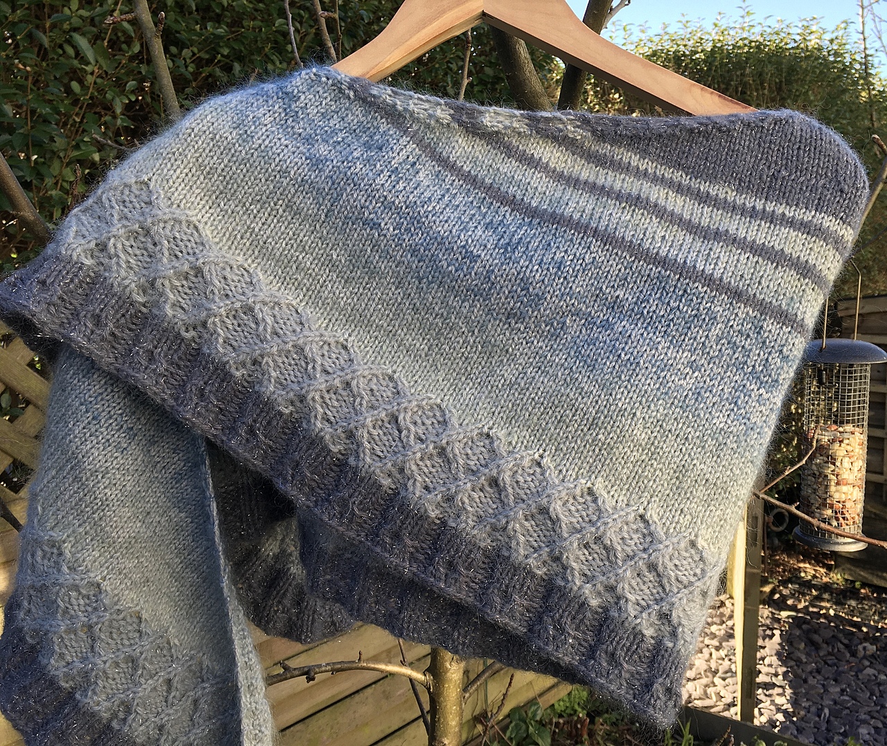 Sally, who created the shawl in shades of blue, used Rico in shades of blue to give a gentler graduation in colour.