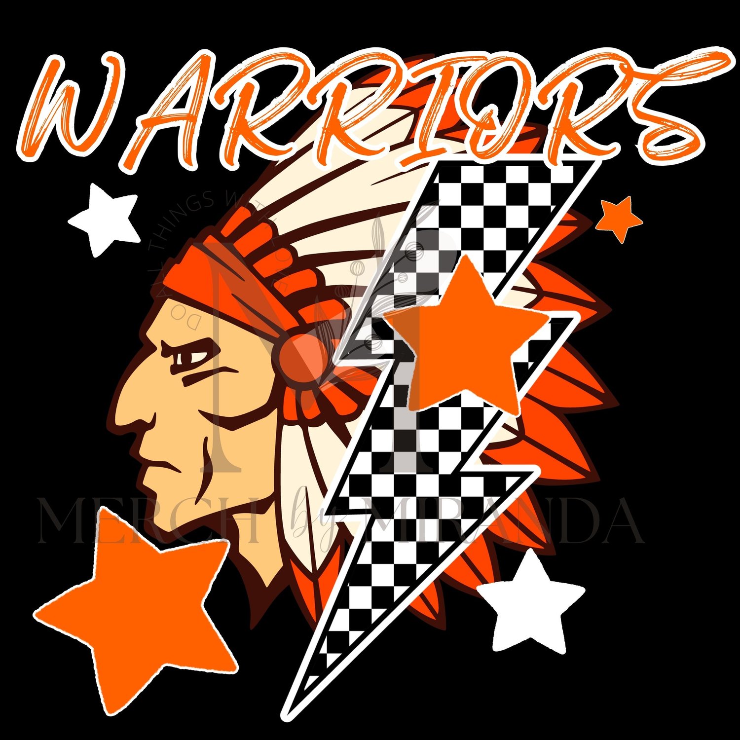 Warrior Mascot Orange | Sublimation Design | Digital Download | School Spirit Shirt PNG | DTF Design | Lightning Bolt-Checkered with Stars - Warriors