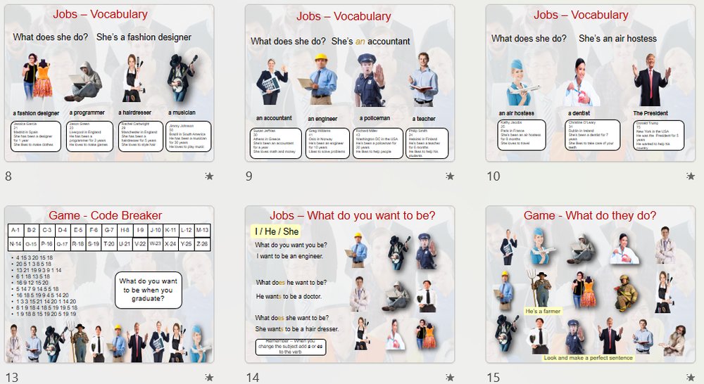 - Vocabulary: 15 clearly taught jobs including teacher, dentist, farmer, fashion designer, hairdresser, policeman, firefighter, accountant, programmer, waiter, musician, president, engineer, air hostess, and banjo player (musician). Students also learn work-related terms like salary, pay, training, and career.